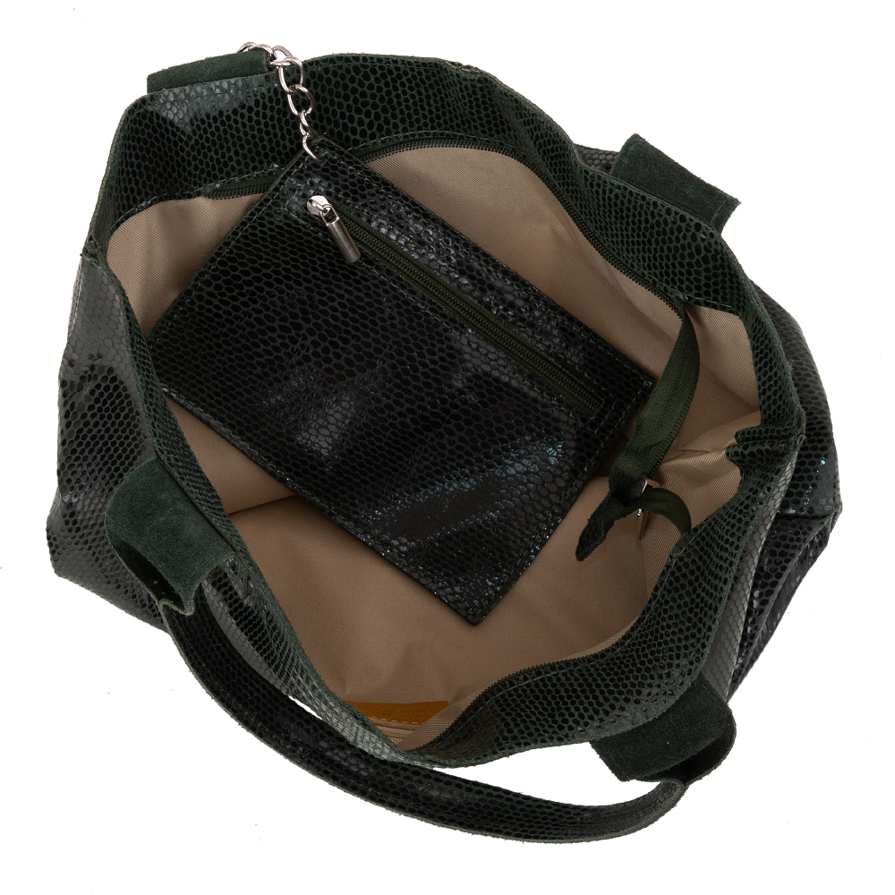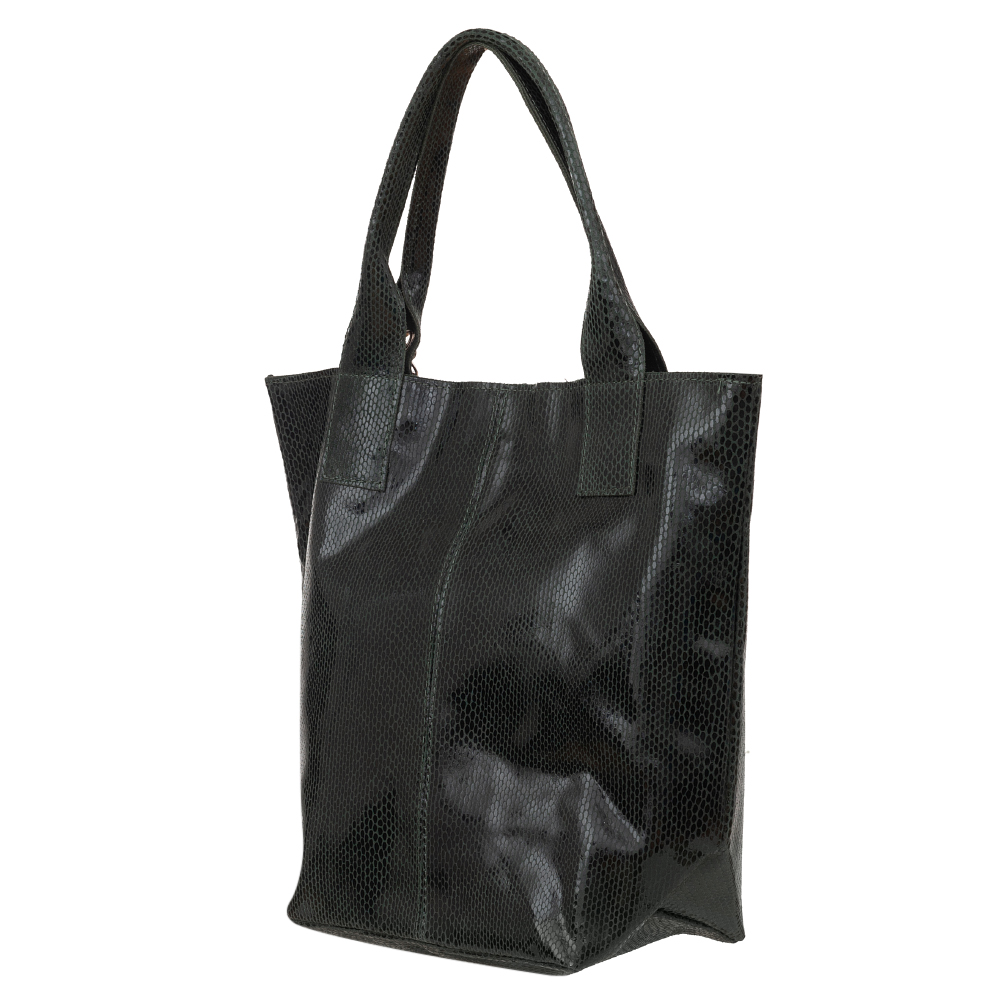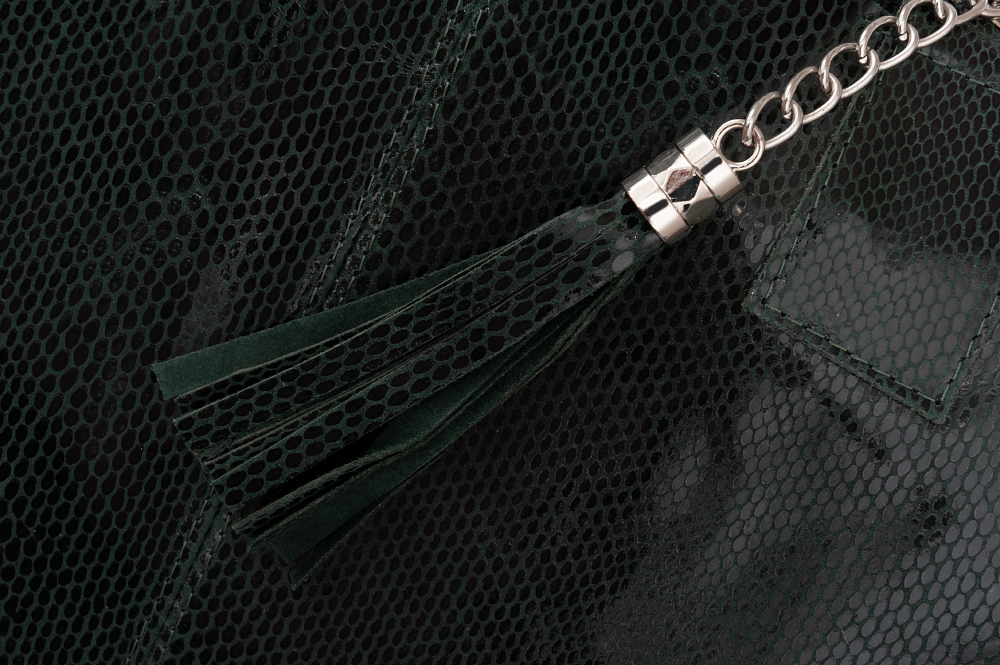 VERA PELLE Włoska skórzana torebka / worek wykonana z miękkiej, lejącej, wysokogatunkowej naturalnej lakierowanej skóry o fakturze ŁUSKI. Bardzo oryginalny i praktyczny model. Zamykana z góry na magnes. W środku duża komora wykończona surową skóra naturalną. W środku saszetka zamykana na suwak. Elementy wykończenia w kolorze srebrnym. Modny pęk frędzli z przodu torebki.