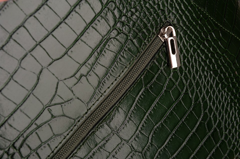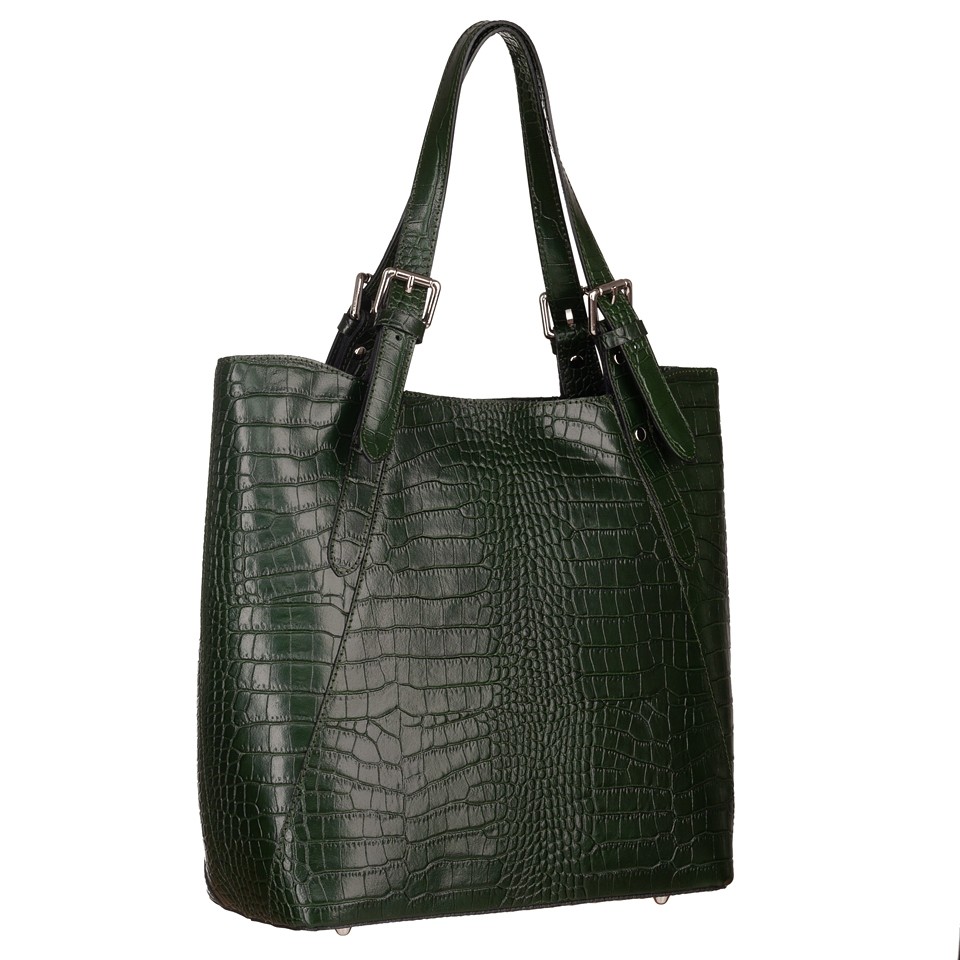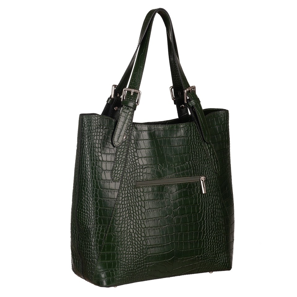 VERA PELLE włoska modna skórzana A4 torebka wykonana z wysokogatunkowej naturalnej skóry z motywem wężowym, łuski krokodyla. Wygodny dostęp do środka. Torebka dwukomorowa, od góry zamykana na suwak. Wewnątrz kieszonka na telefon + kieszonka na zamek + duża kieszeń na środku dzieląca torebkę na 2 komory. Torebka od środka wykończona porządną, materiałową podszewką. Elementy wykończenia w kolorze srebrnym. Z tyłu kieszeń na suwak. Uszy z możliwością regulacji długości. Dno usztywnione i podbite nóżkami, aby nie niszczył się spód.