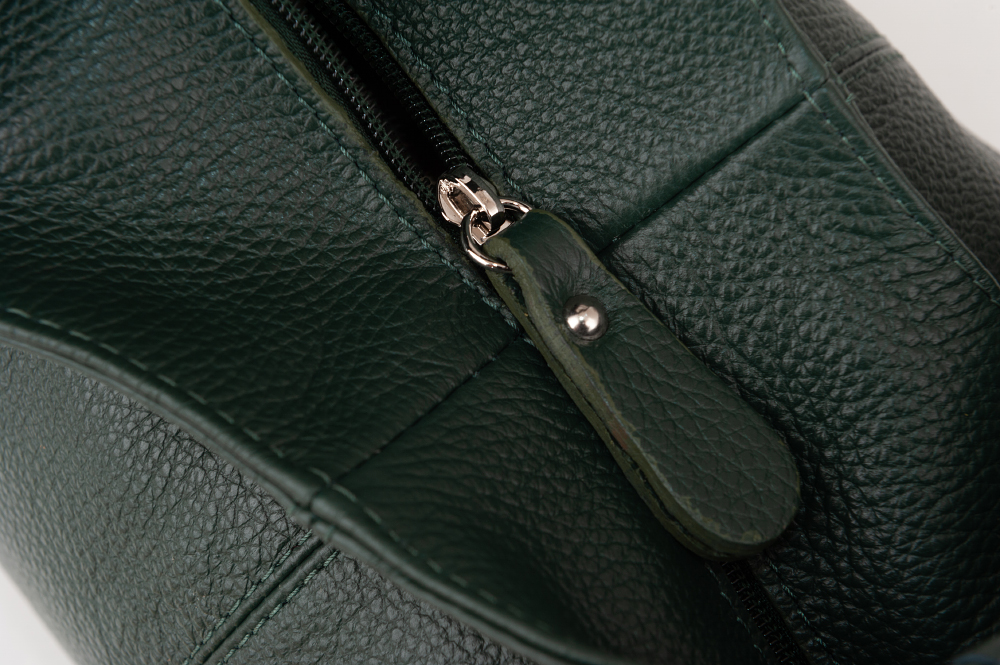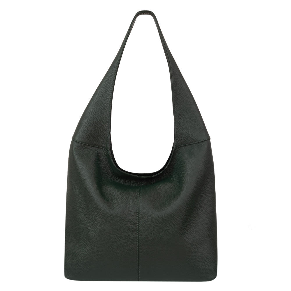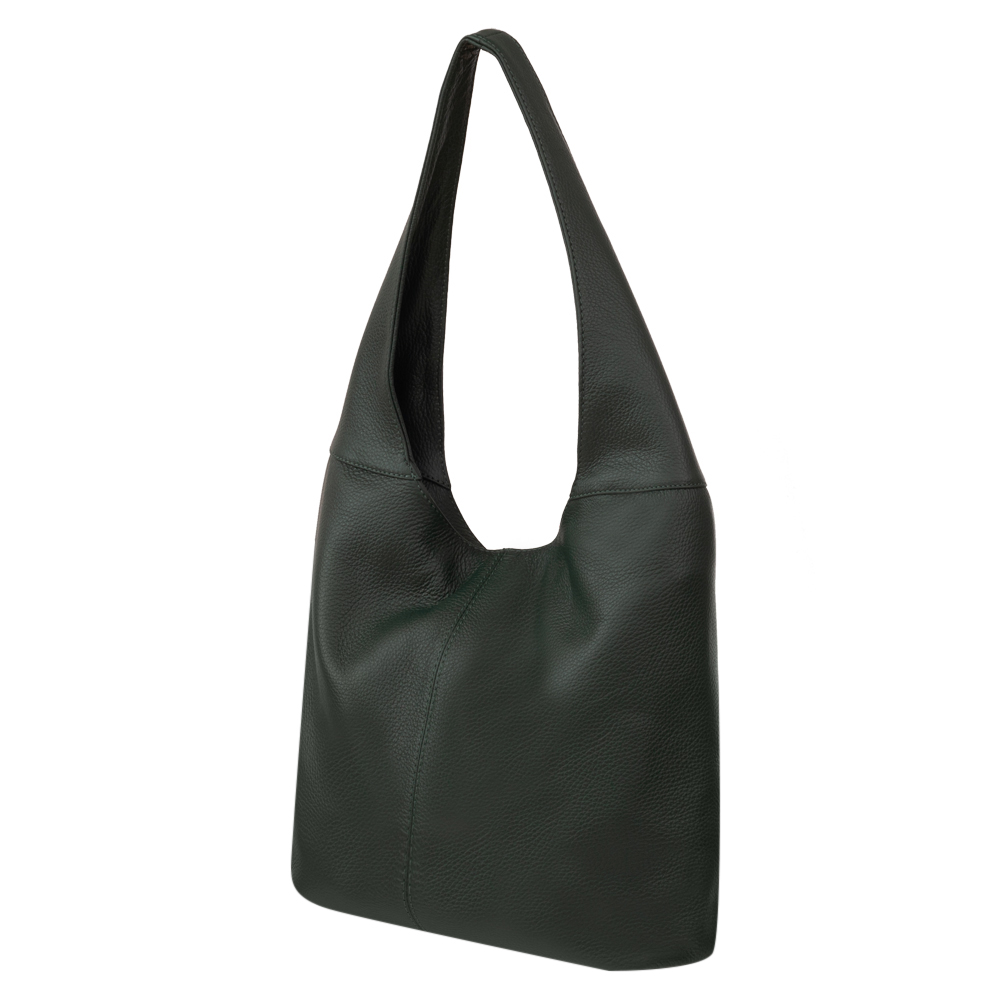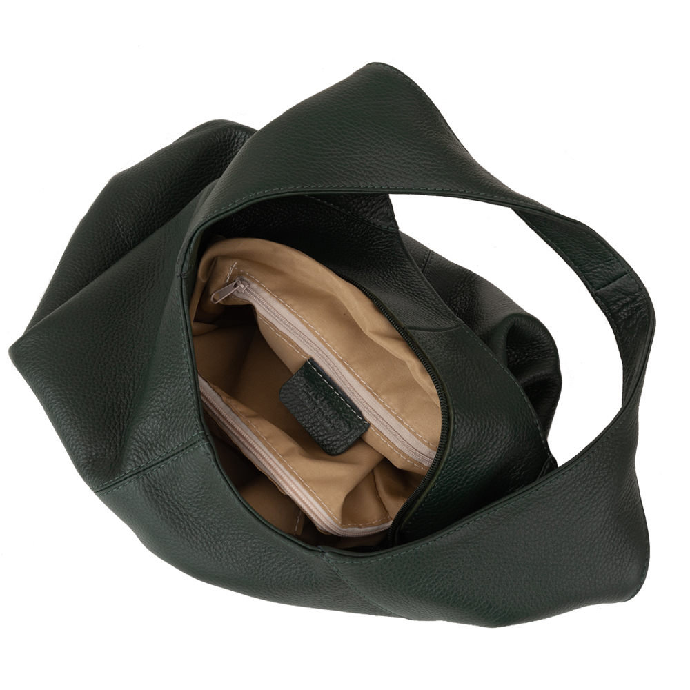 Włoska skórzana torebka / worek wykonana z wysokogatunkowej naturalnej miękkiej skóry. Zamykana z góry na suwak. Torebka dwukomorowa przedzielona na środku dużą kieszenią na suwak + wewnątrz jedna kieszonka na zamek oraz jedna na telefon. Wnętrze wykończone trwałą, czarną podszewką. Torebkę można nosić wygodnie na ramieniu dzięki szerokiemu paskowi.