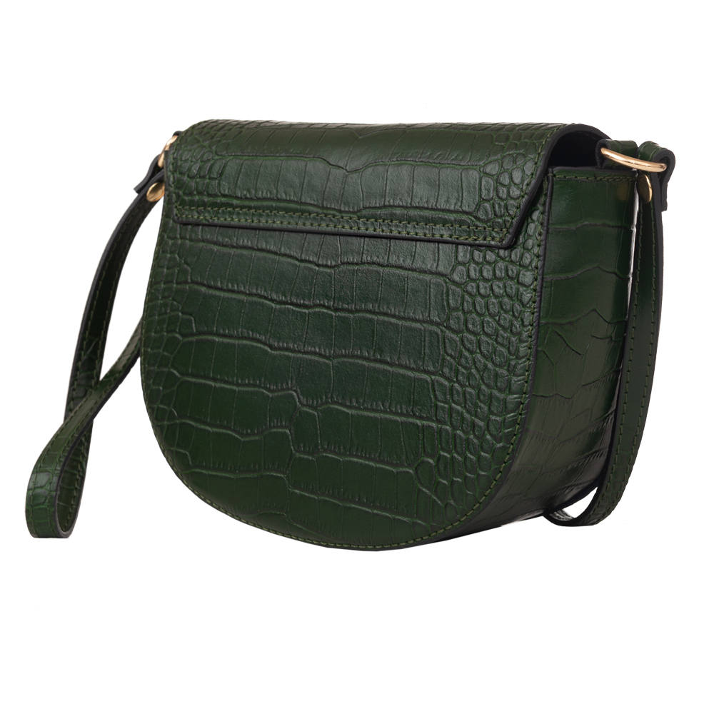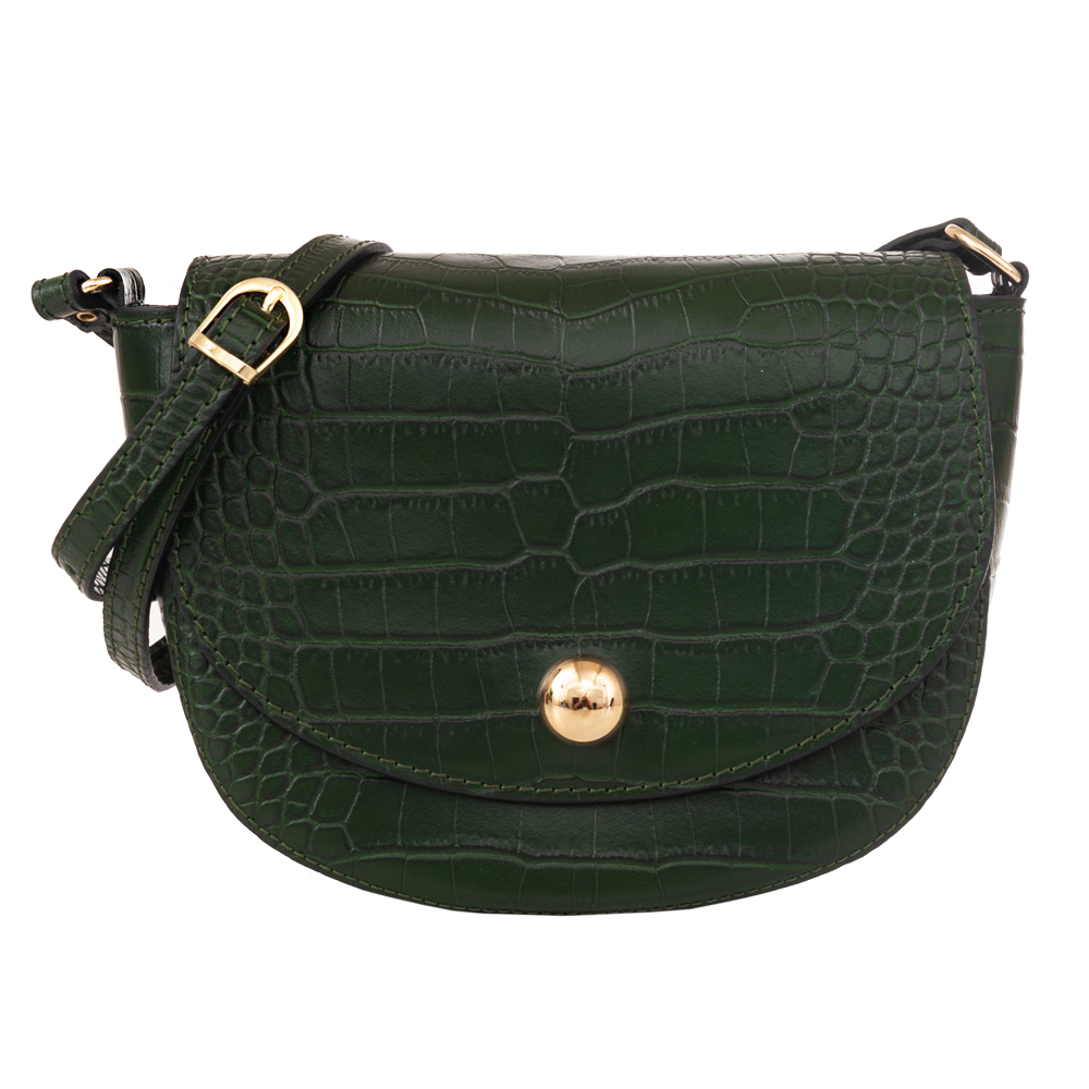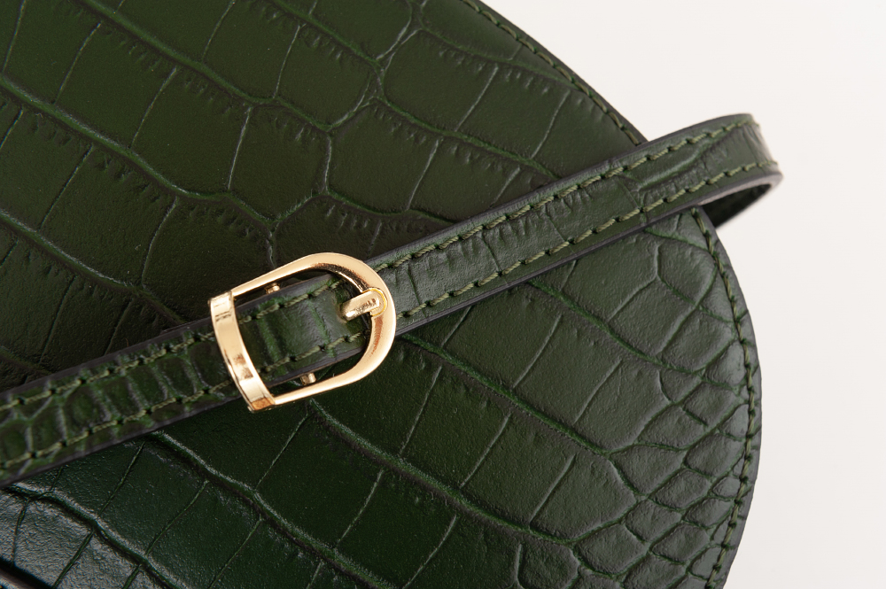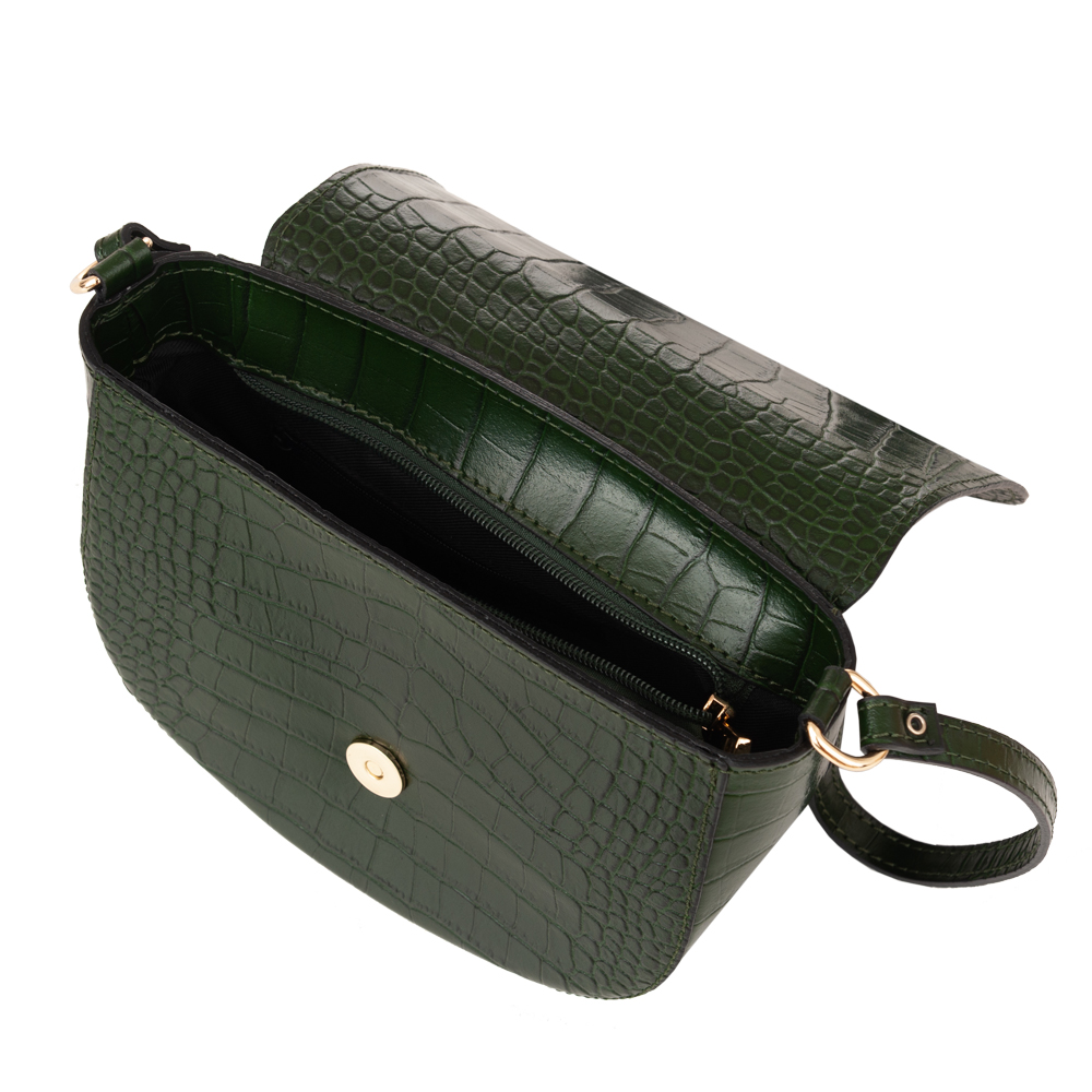Hit sezonu! Oryginalna i modna włoska skórzana torebka listonoszka wykonana z wysokogatunkowej naturalnej skóry licowej z fakturą łuski krokodyla firmy Vera Pelle. Zamykana z góry na suwak + klapa na magnes. Torebka jednokomorowa, wewnątrz jedna kieszonka na zamek. Wnętrze wykończone trwałą, materiałową czarną podszewką. Długi, regulowany pasek umożliwia wygodne noszenie na ramieniu lub przez ramię. Elementy wykończenia, zamki w kolorze złotym.