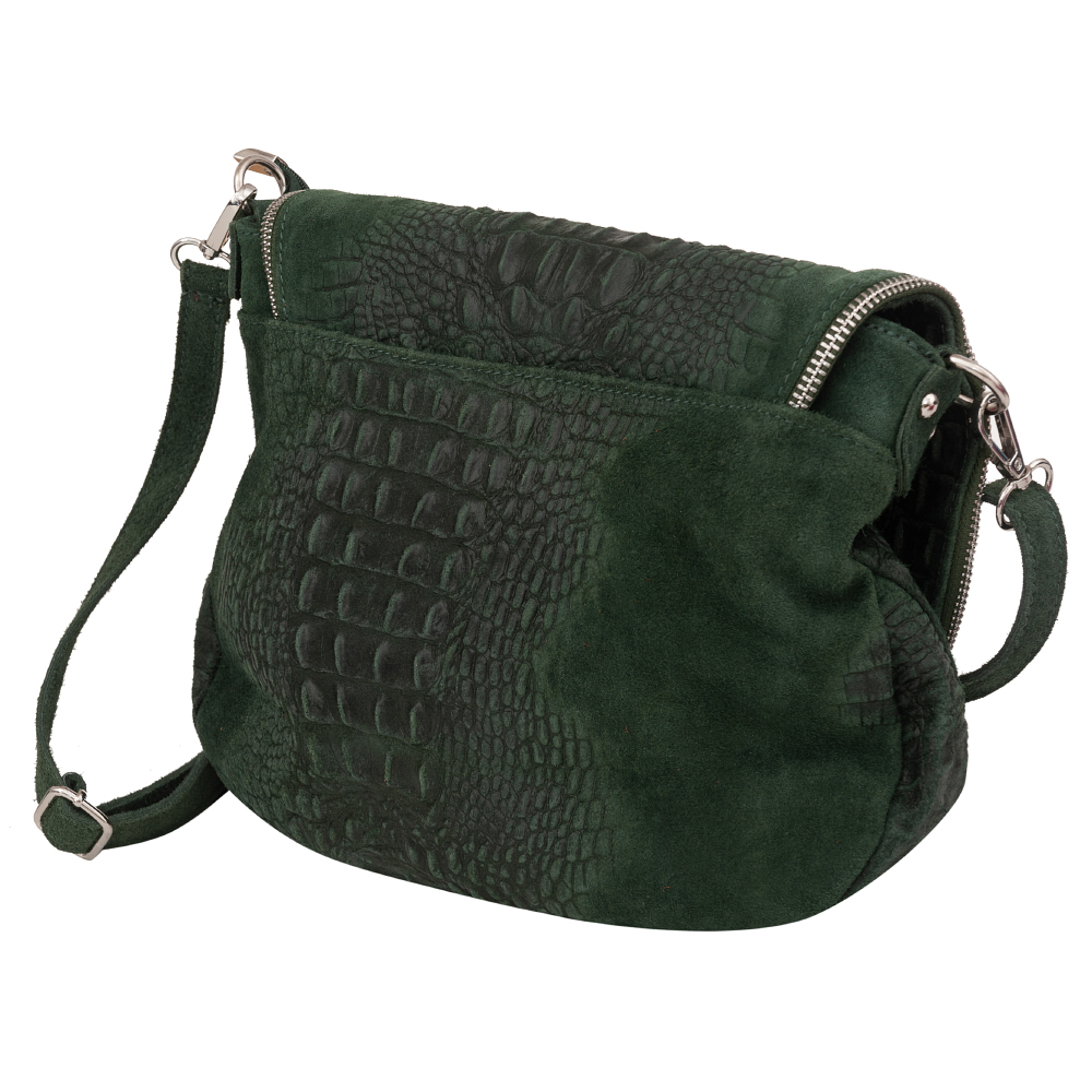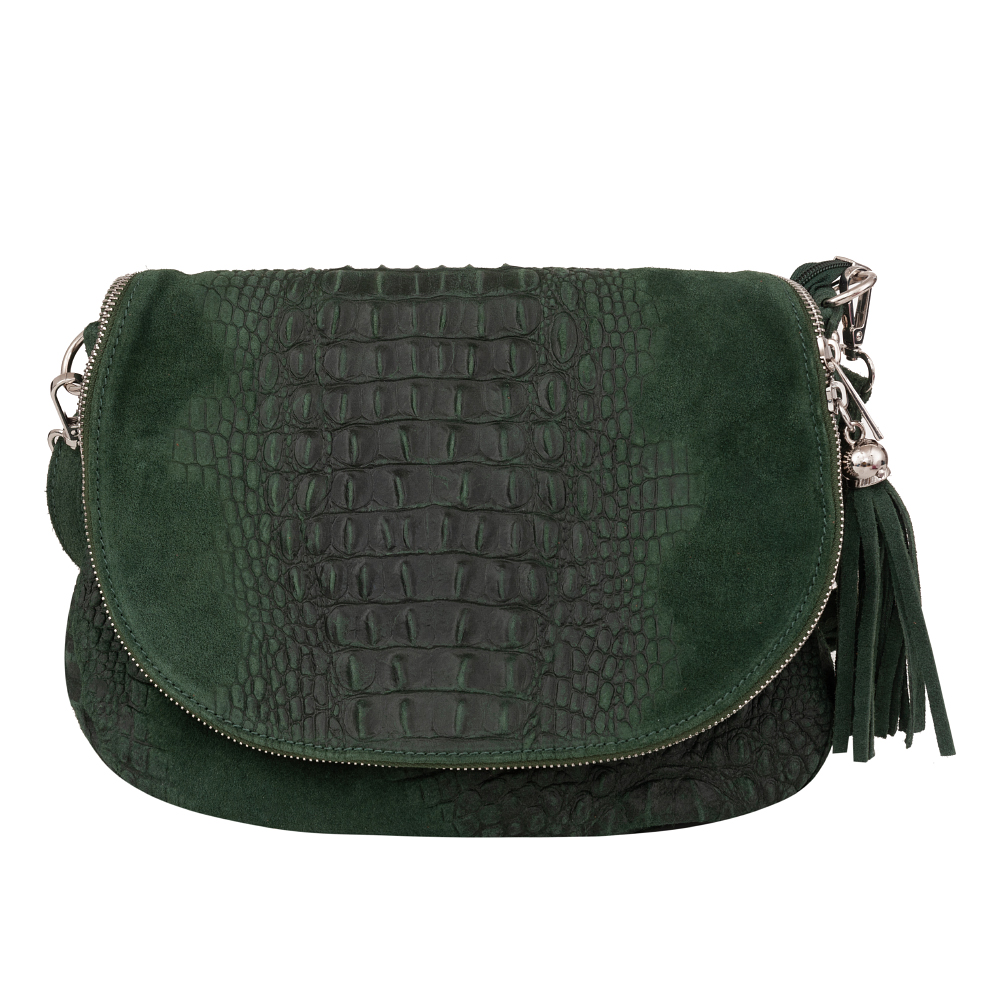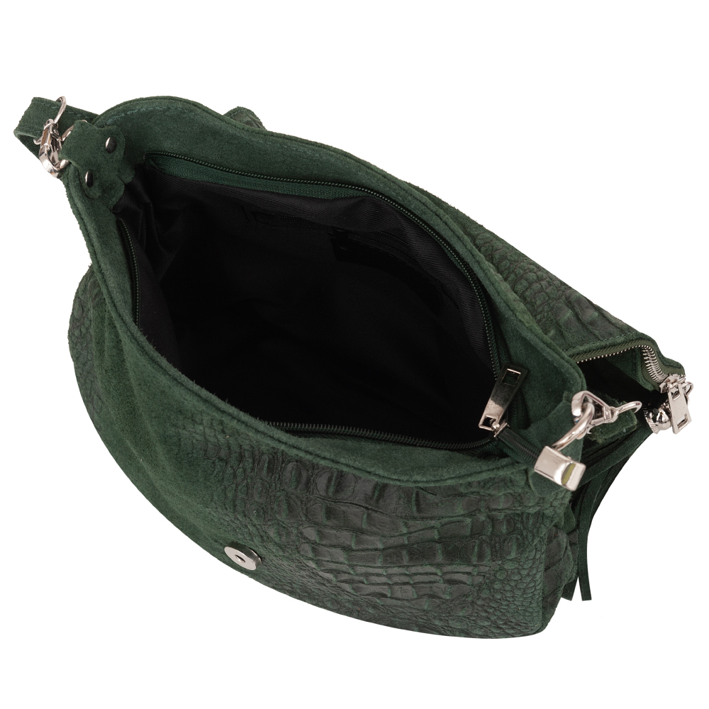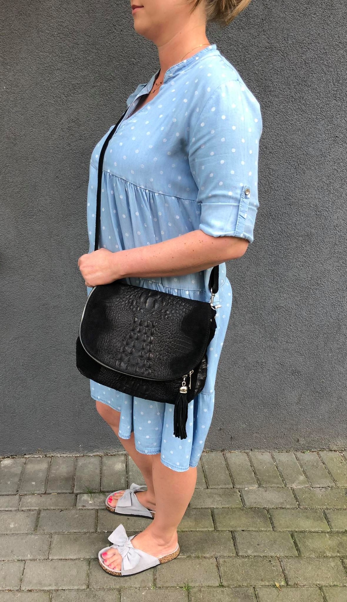 Vera Pelle - Włoska pojemna, modna skórzana listonoszka wykonana z wysokogatunkowej naturalnej skóry z motywem łuski krokodyla łączonej z gładkim zamszem naturalnym. Zamykana na dużą klapę na magnes + suwak. Torebka jednokomorowa, wewnątrz jedna kieszonka na zamek. Wnętrze wykończone trwałą, materiałową podszewką w kolorze czarnym. Długi, regulowany pasek umożliwia wygodne noszenie na ramieniu. Dodatkowa kieszeń w klapie torebki na suwak. Elementy wykończenia w kolorze srebrnym.