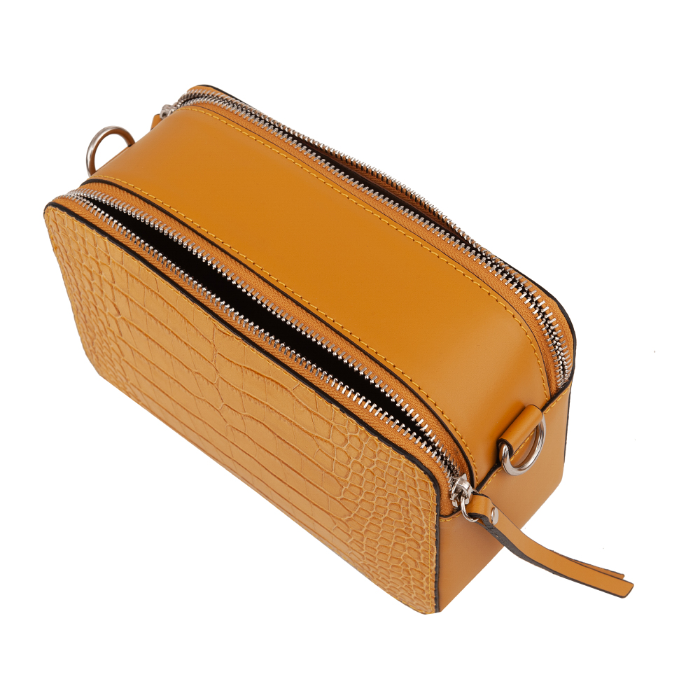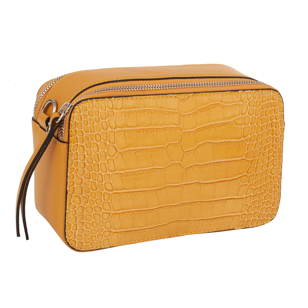 Włoska skórzana torebka listonoszka wykonana z wysokogatunkowej naturalnej skóry firmy VERA PELLE. Zamykana z góry na zamek. Torebka jednokomorowa, dwa wejścia do jednej przegrody. Elementy wykończenia w kolorze srebrnym. Skórzany szeroki pasek (3cm) z możliwością całkowitego odpięcia, dzięki czemu torebkę można nosić jako elegancką kopertówkę. Z przodu i z tyłu wstawka ze skóry z fakturą łuski krokodyla.