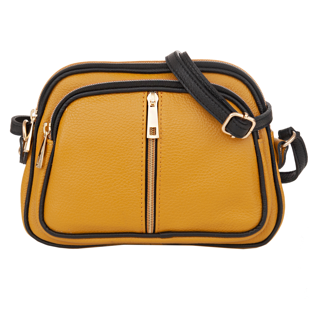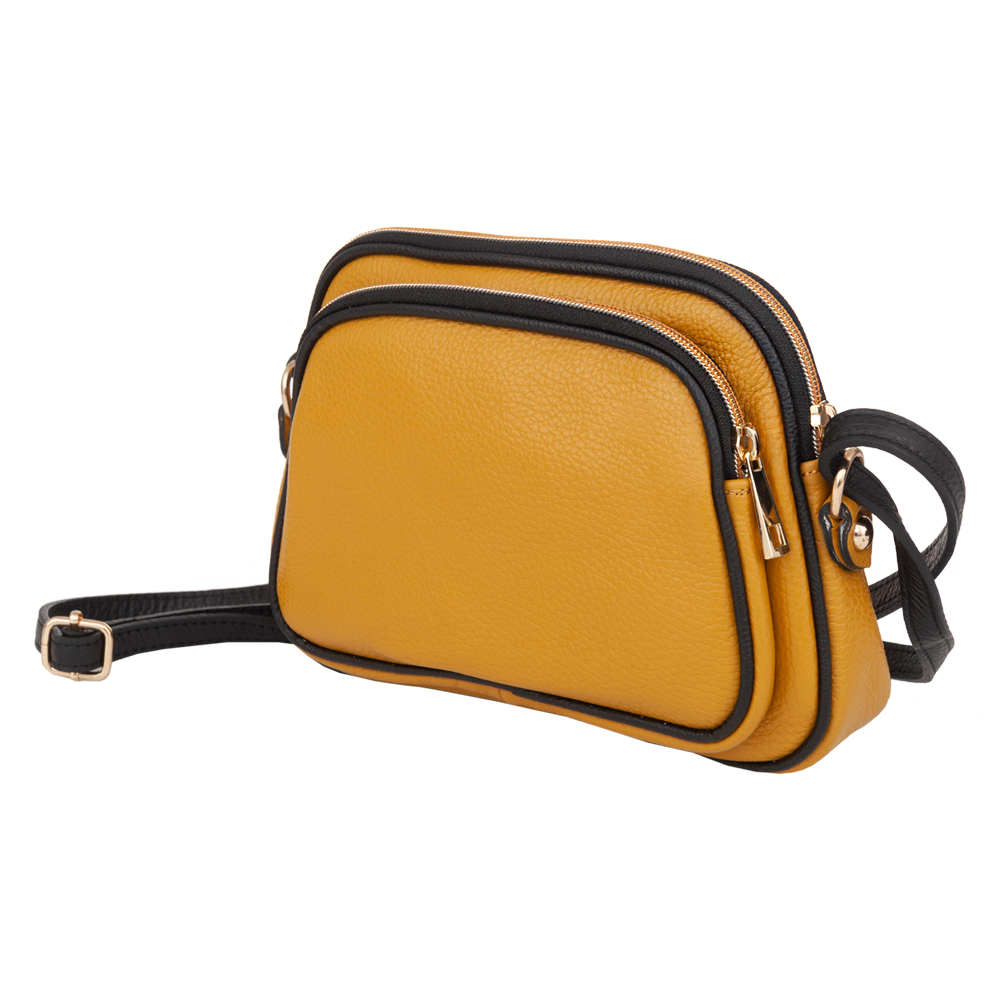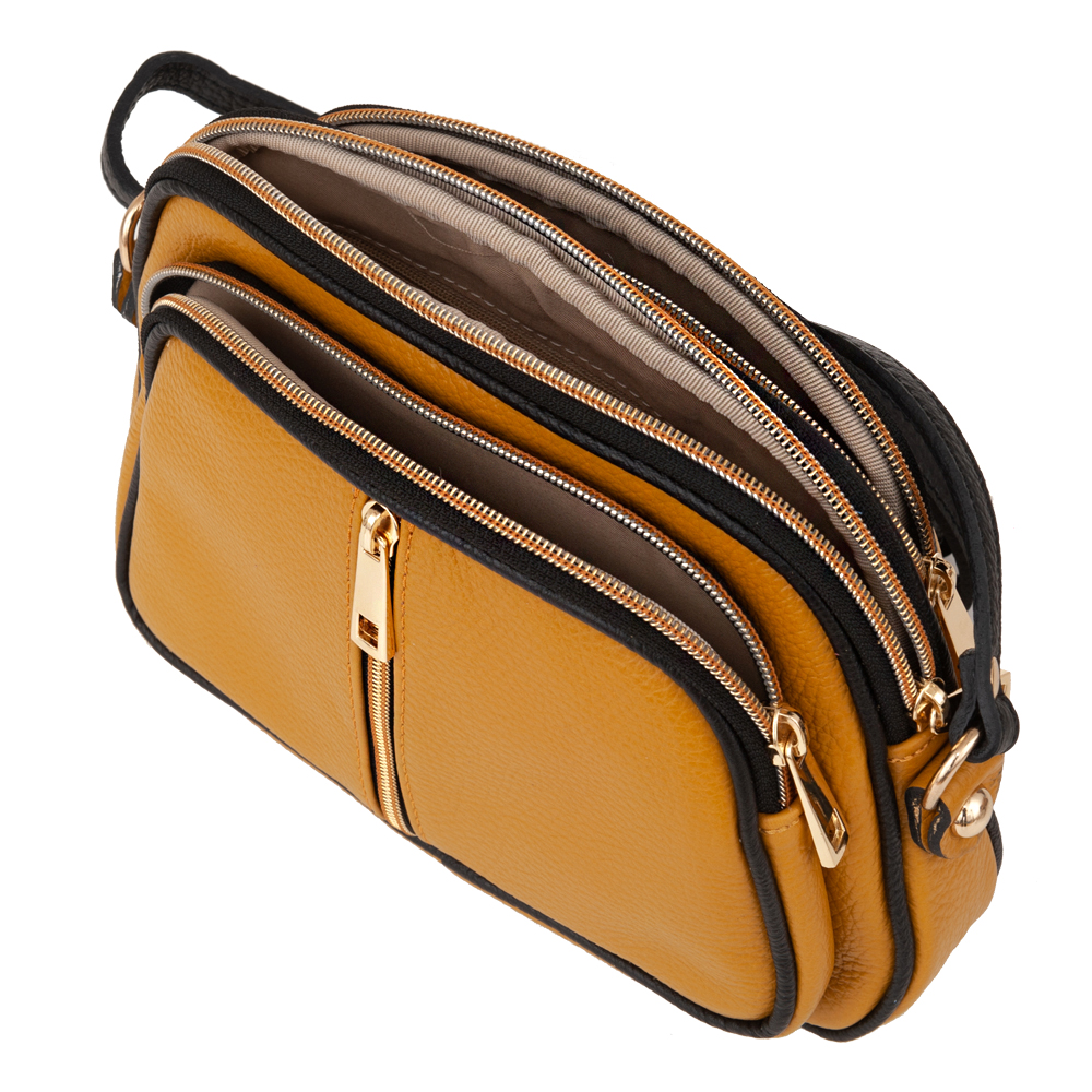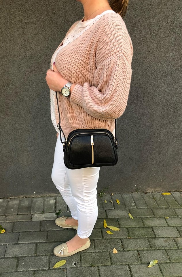 Włoska skórzana torebka listonoszka wykonana z wysokogatunkowej naturalnej skóry firmy VERA PELLE. Pojemny i poręczny model torebki. Torebka trzykomorowa, w środkowej największej komorze dodatkowo kieszonka na zamek. Metalowe elementy w kolorze złotym. Pasek z możliwością regulacji długości. Dodatkowa pionowa kieszonka z przodu. Lamówki i pasek w kolorze czarnym.
