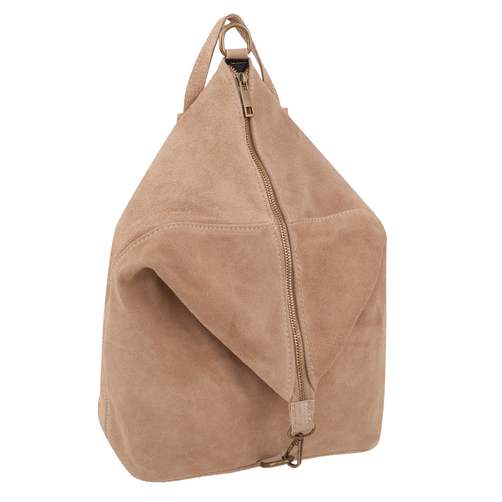 Vera Pelle Włoska skórzana torebka plecak wykonana w 100% z naturalnej miękkiej skóry zamszowej. Zamykana na zamek. Plecak jednokomorowy, wewnątrz jedna kieszonka na zamek, jedna na telefon. Dodatkowo z tyłu kieszonka na zamek. Wnętrze wykończone trwałą, materiałową czarną podszewką. Uszy regulowane na długość 46 - 92 cm, możliwość noszenia plecaka w ręce. Metalowe elementy w kolorze złotym