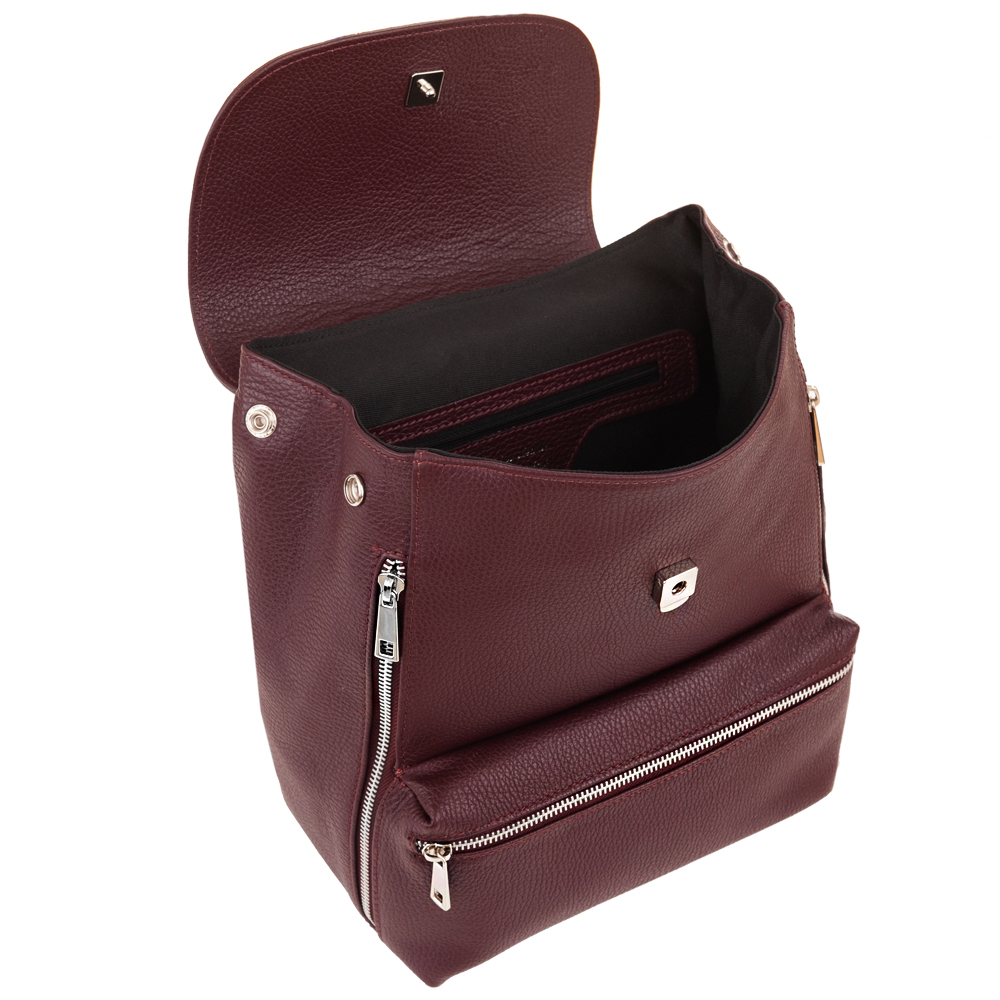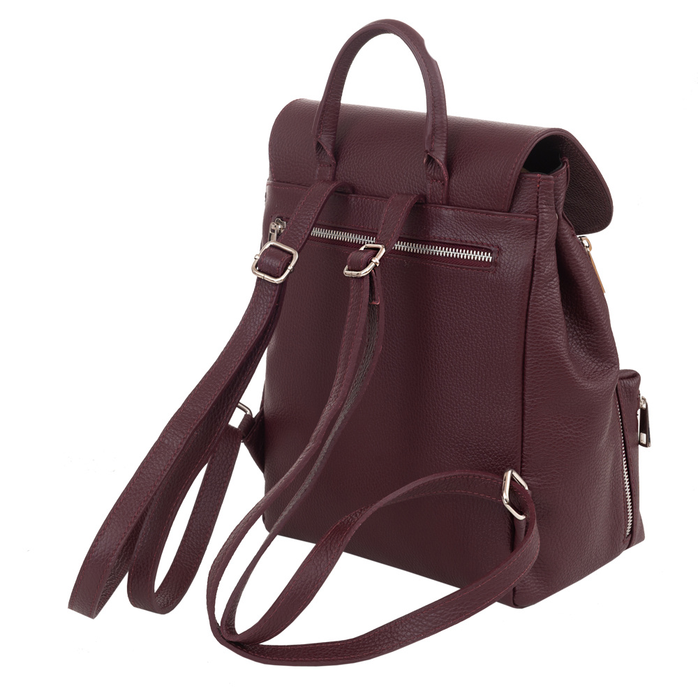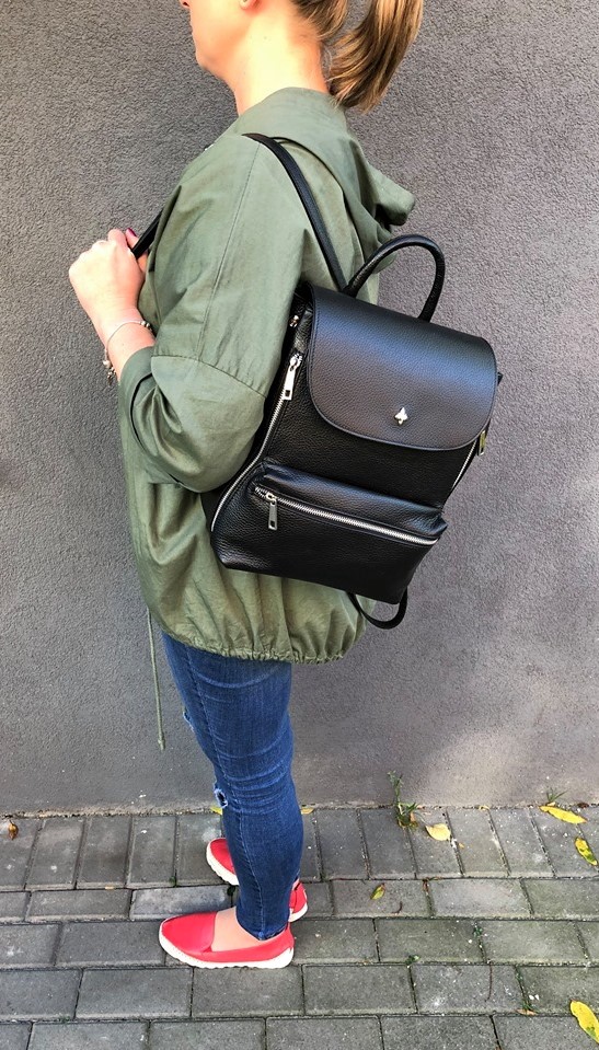 MADE IN ITALY - GENUINE LEATHER. Włoski modny i elegancki skórzany PLECAK torba wykonany w całości z wysokogatunkowej naturalnej, miękkiej skóry. Zamykany na klapę. W głównej komorze kieszeń na telefon + kieszonka na zamek + dodatkowa kieszonka. Wnętrze wykończone materiałową trwałą, czarną podszewką. Dodatkowo jedna kieszonka pozioma z przodu + dwie kieszonki pionowe + z tyłu kieszeń. Plecak lekko usztywniony od spodu. Elementy wykończenia w kolorze srebrnym. Uszy z możliwością regulacji długości 52-110 cm. Można nosić jako plecak lub w dłoni.