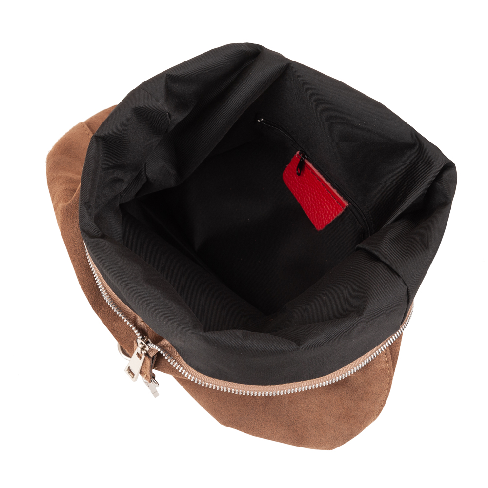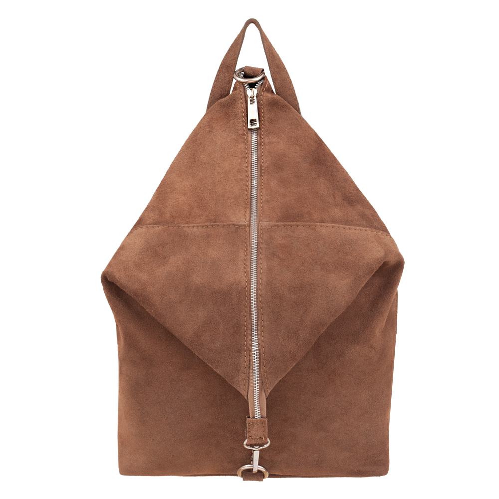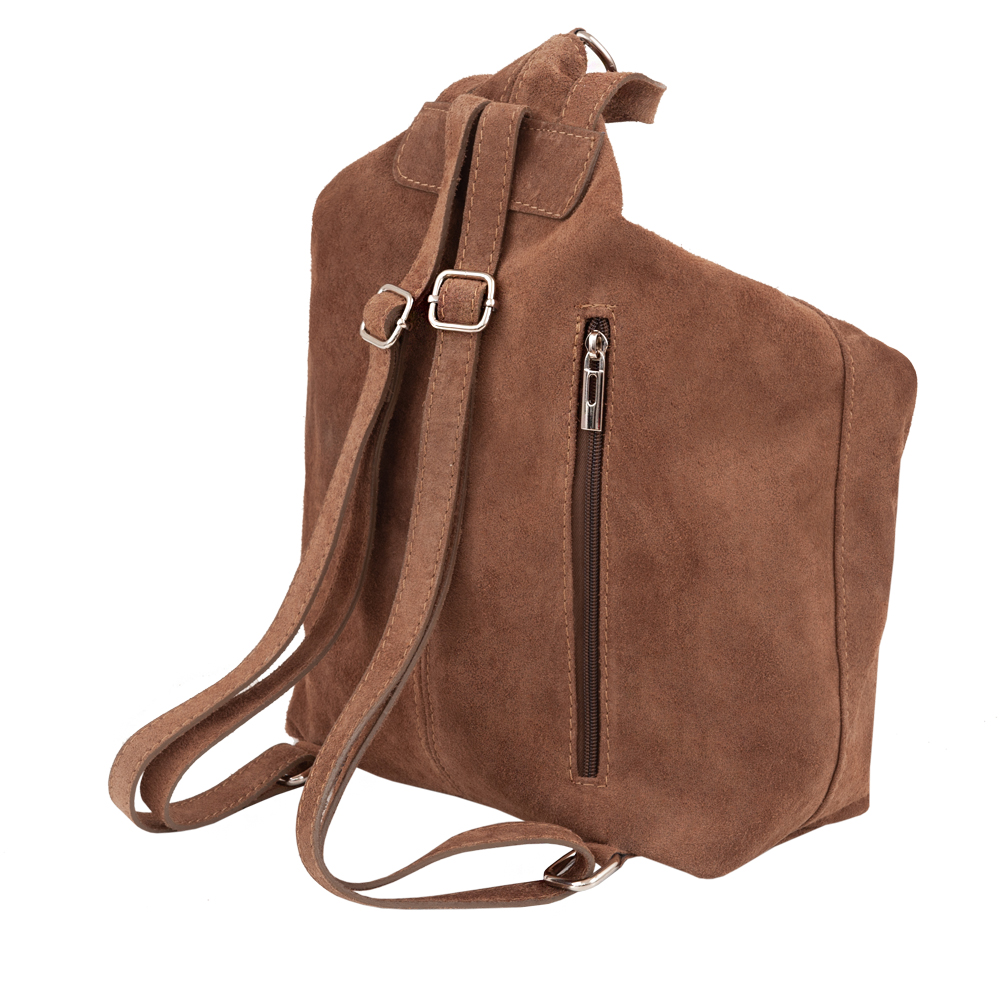 Vera Pelle Włoska skórzana torebka plecak wykonana w 100% z naturalnej miękkiej skóry zamszowej. Zamykana na zamek. Plecak jednokomorowy, wewnątrz jedna kieszonka na zamek, jedna na telefon. Dodatkowo z tyłu kieszonka na zamek. Wnętrze wykończone trwałą, materiałową czarną podszewką. Uszy regulowane na długość 46 - 92 cm, możliwość noszenia plecaka w ręce. Metalowe elementy w kolorze srebrnym.