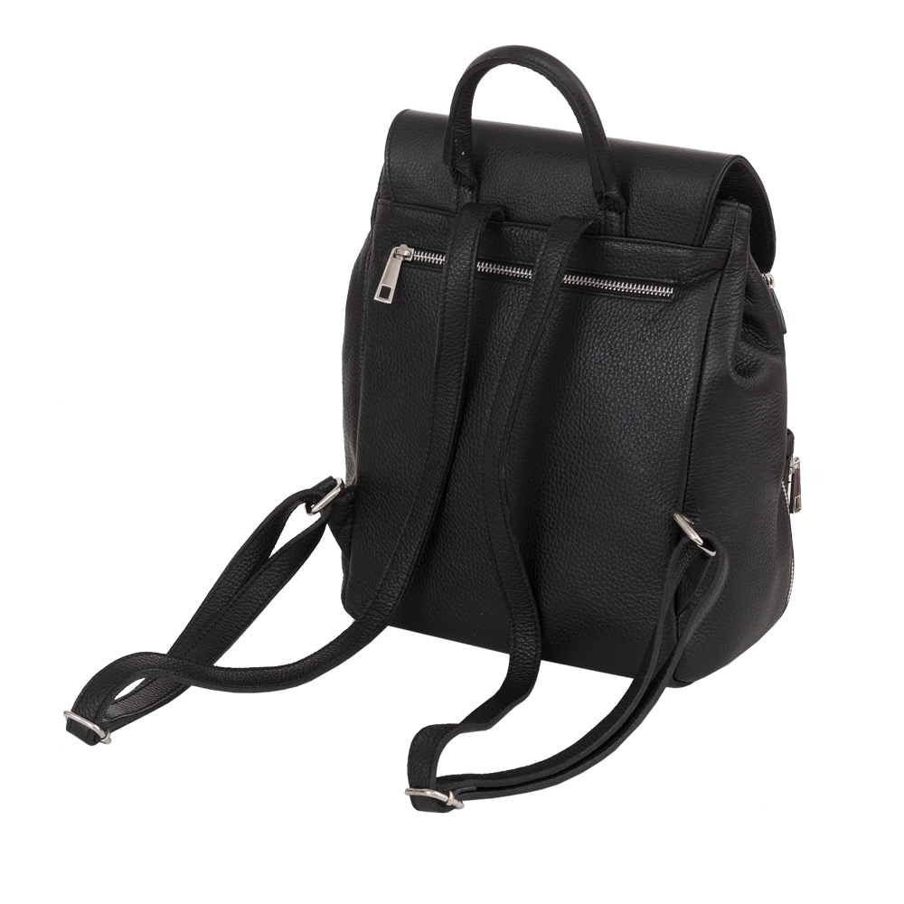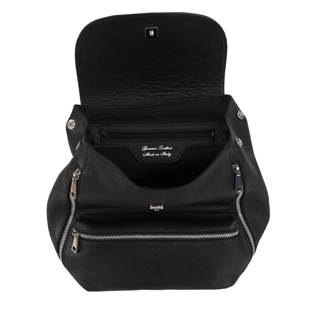 MADE IN ITALY - GENUINE LEATHER. Włoski modny i elegancki skórzany PLECAK torba wykonany w całości z wysokogatunkowej naturalnej, miękkiej skóry. Zamykany na klapę. W głównej komorze kieszeń na telefon + kieszonka na zamek + dodatkowa kieszonka. Wnętrze wykończone materiałową trwałą, czarną podszewką. Dodatkowo jedna kieszonka pozioma z przodu + dwie kieszonki pionowe + z tyłu kieszeń. Plecak lekko usztywniony od spodu. Elementy wykończenia w kolorze srebrnym. Uszy z możliwością regulacji długości 52-110 cm. Można nosić jako plecak lub w dłoni.