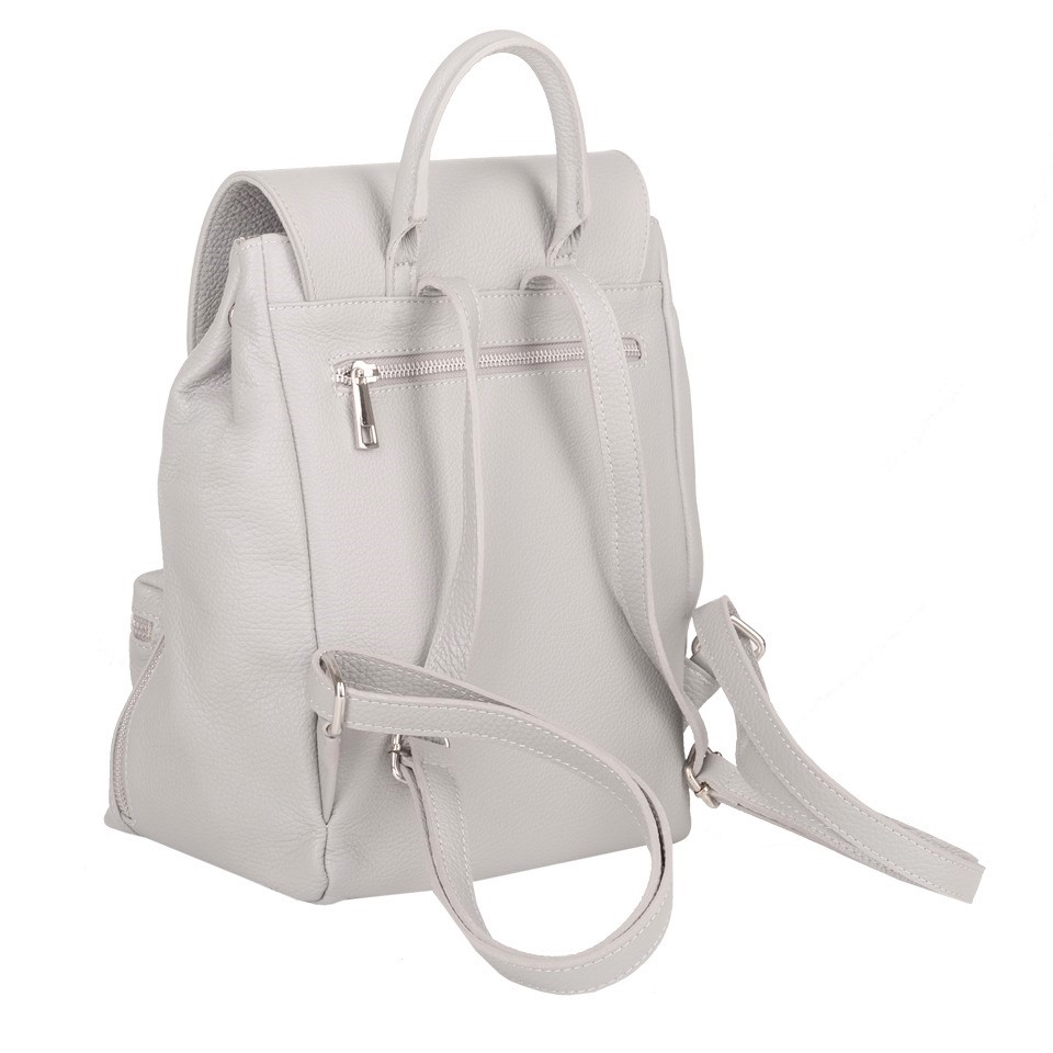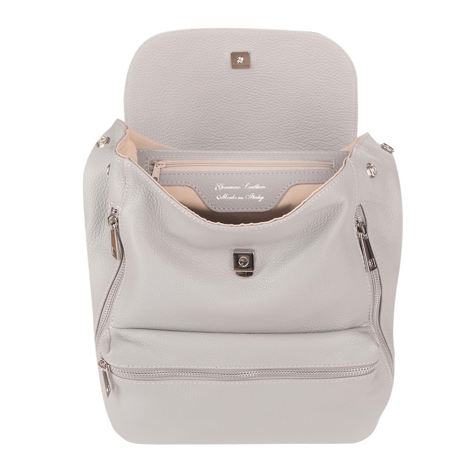 MADE IN ITALY - GENUINE LEATHER. Włoski modny i elegancki skórzany PLECAK torba wykonany w całości z wysokogatunkowej naturalnej, miękkiej skóry. Zamykany na klapę. W głównej komorze kieszeń na telefon + kieszonka na zamek + dodatkowa kieszonka. Wnętrze wykończone materiałową trwałą, jasną podszewką. Dodatkowo jedna kieszonka pozioma z przodu + dwie kieszonki pionowe + z tyłu kieszeń. Plecak lekko usztywniony od spodu. Elementy wykończenia w kolorze srebrnym. Uszy z możliwością regulacji długości 52-110 cm. Można nosić jako plecak lub w dłoni.