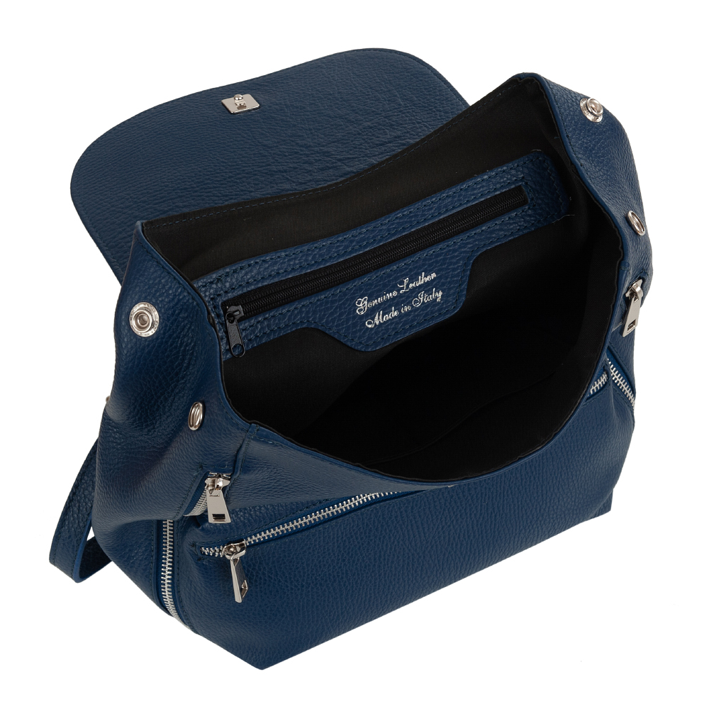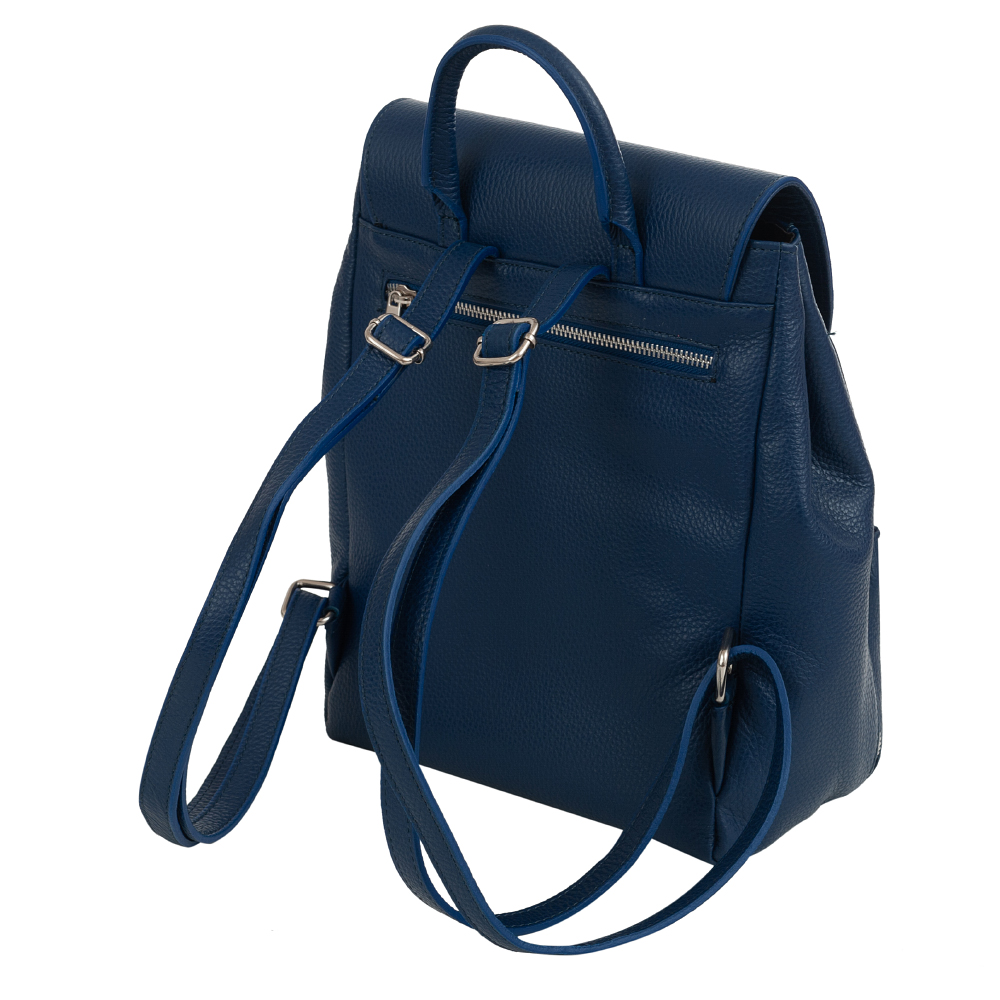 MADE IN ITALY - GENUINE LEATHER. Włoski modny i elegancki skórzany PLECAK torba wykonany w całości z wysokogatunkowej naturalnej, miękkiej skóry. Zamykany na klapę. W głównej komorze kieszeń na telefon + kieszonka na zamek + dodatkowa kieszonka. Wnętrze wykończone materiałową trwałą, czarną podszewką. Dodatkowo jedna kieszonka pozioma z przodu + dwie kieszonki pionowe + z tyłu kieszeń. Plecak lekko usztywniony od spodu. Elementy wykończenia w kolorze srebrnym. Uszy z możliwością regulacji długości 52-110 cm. Można nosić jako plecak lub w dłoni.