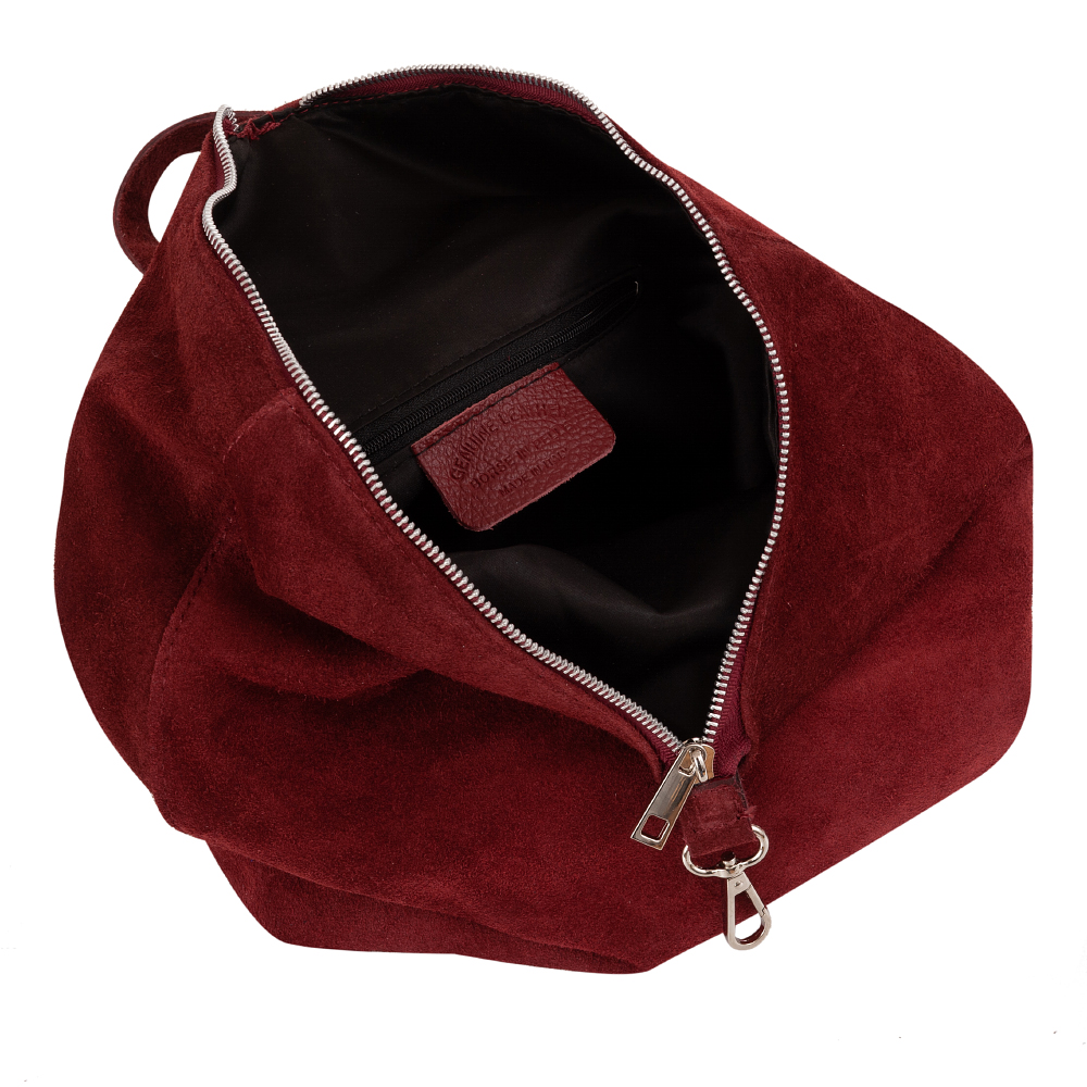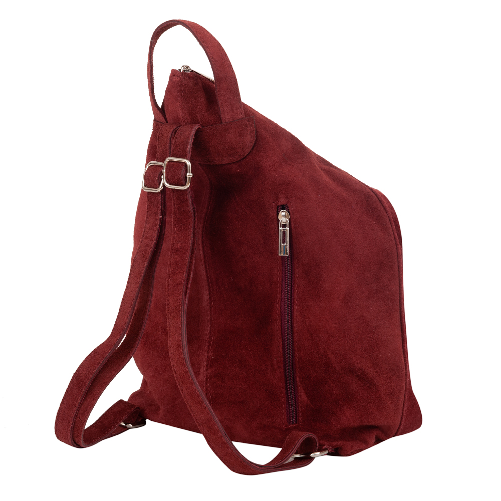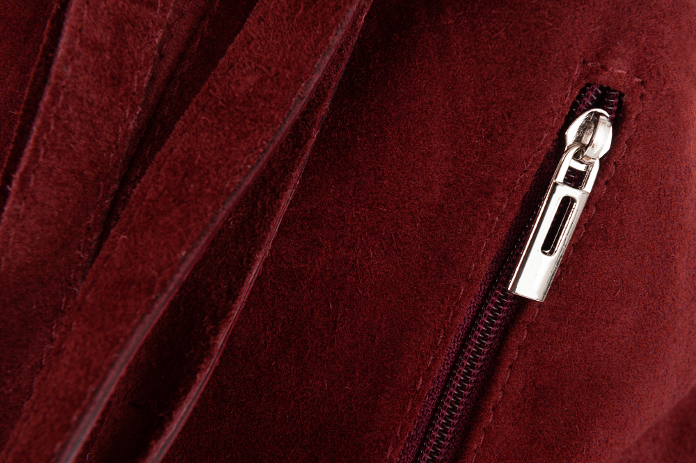 Vera Pelle Włoska skórzana torebka plecak wykonana w 100% z naturalnej miękkiej skóry zamszowej. Zamykana na zamek. Plecak jednokomorowy, wewnątrz jedna kieszonka na zamek, jedna na telefon. Dodatkowo z tyłu kieszonka na zamek. Wnętrze wykończone trwałą, materiałową czarną podszewką. Uszy regulowane na długość 46 - 92 cm, możliwość noszenia plecaka w ręce. Metalowe elementy w kolorze srebrnym.