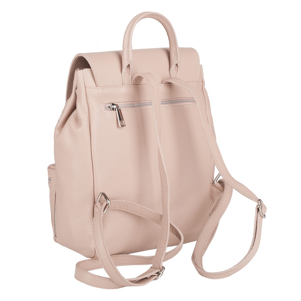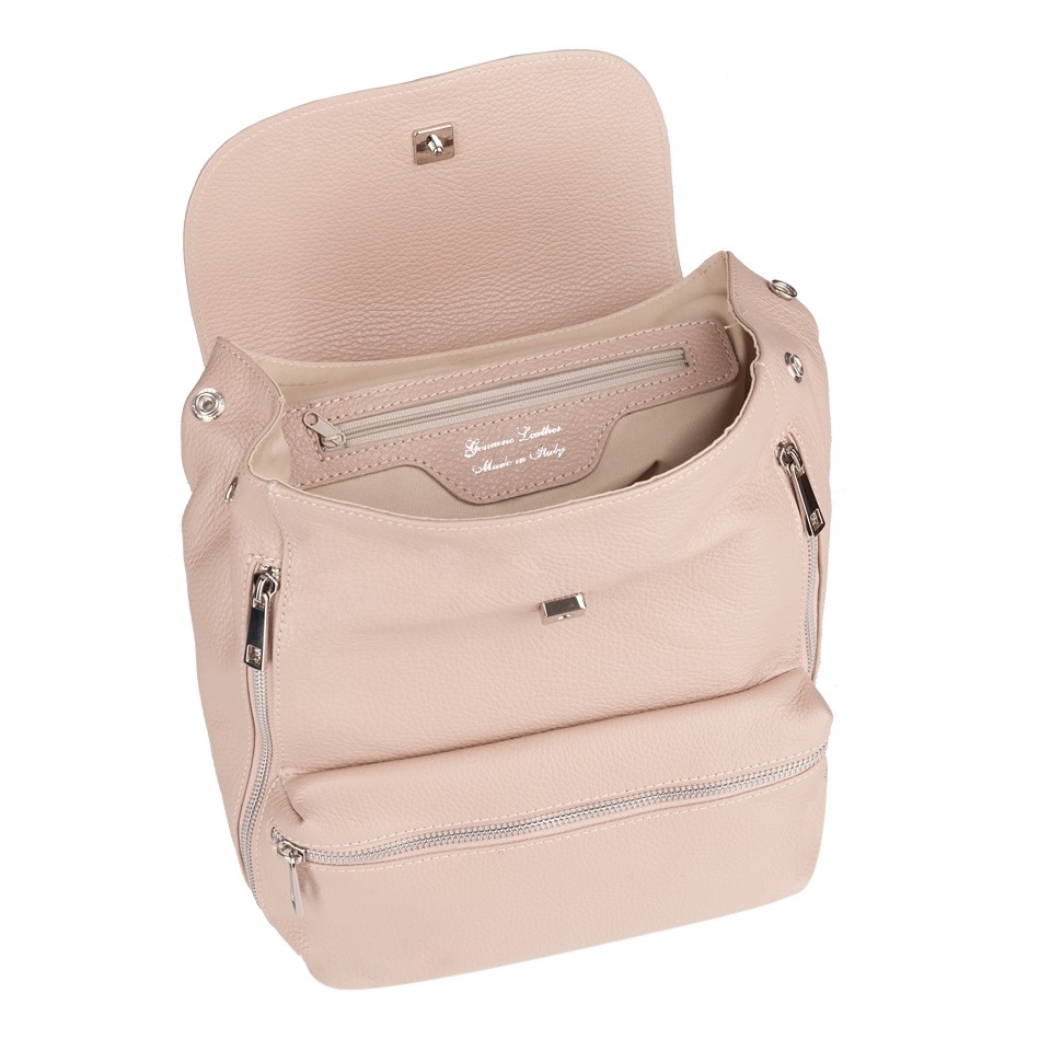 MADE IN ITALY - GENUINE LEATHER. Włoski modny i elegancki skórzany PLECAK torba wykonany w całości z wysokogatunkowej naturalnej, miękkiej skóry. Zamykany na klapę. W głównej komorze kieszeń na telefon + kieszonka na zamek + dodatkowa kieszonka. Wnętrze wykończone materiałową trwałą, jasną podszewką. Dodatkowo jedna kieszonka pozioma z przodu + dwie kieszonki pionowe + z tyłu kieszeń. Plecak lekko usztywniony od spodu. Elementy wykończenia w kolorze srebrnym. Uszy z możliwością regulacji długości 52-110 cm. Można nosić jako plecak lub w dłoni.