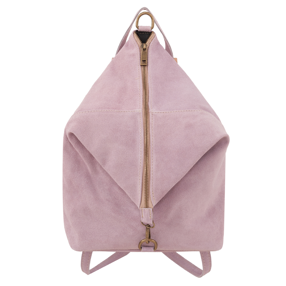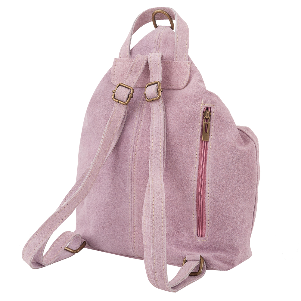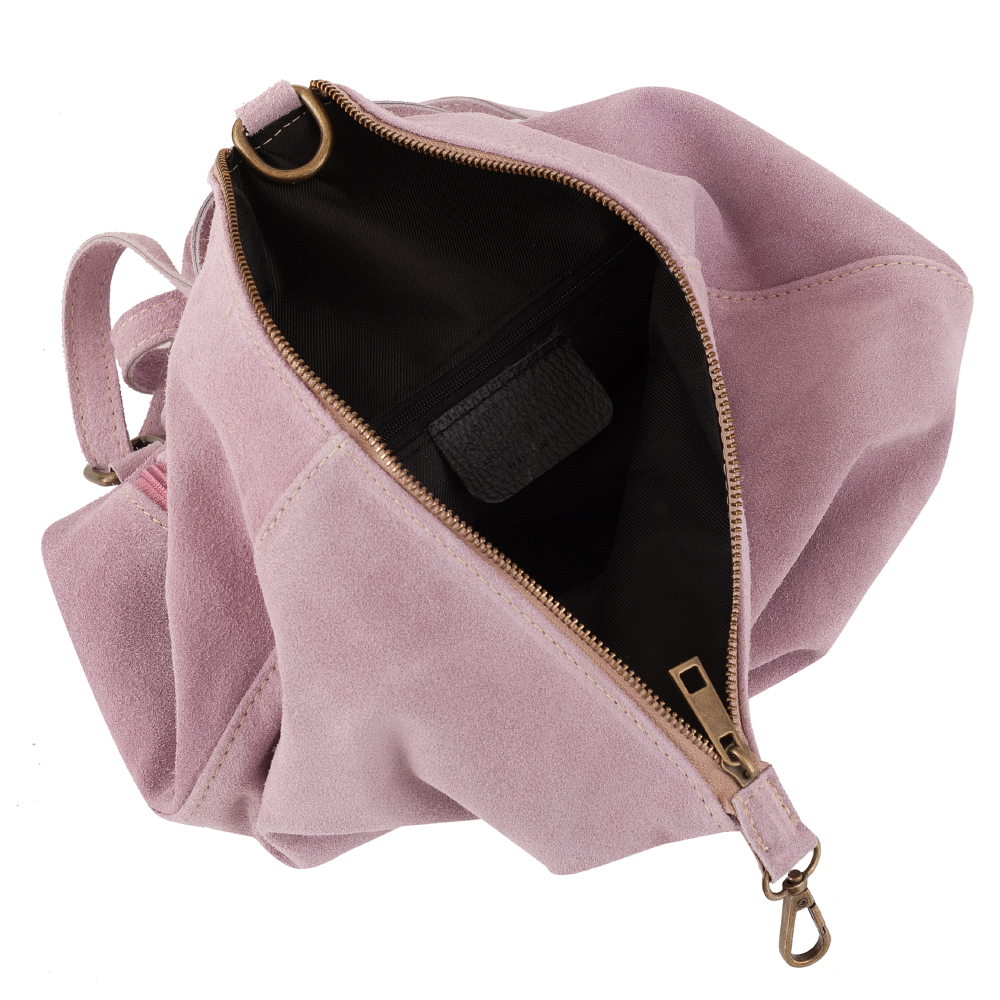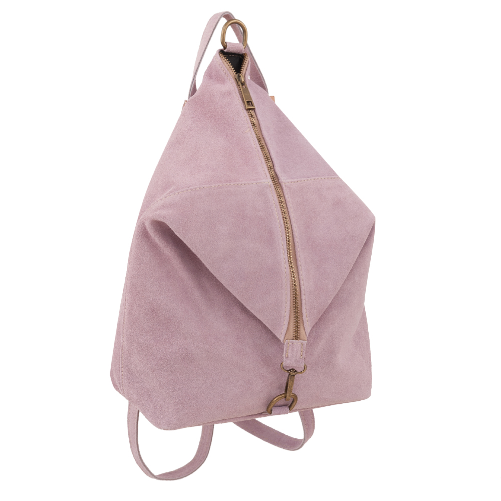 Vera Pelle Włoska skórzana torebka plecak wykonana w 100% z naturalnej miękkiej skóry zamszowej. Zamykana na zamek. Plecak jednokomorowy, wewnątrz jedna kieszonka na zamek, jedna na telefon. Dodatkowo z tyłu kieszonka na zamek. Wnętrze wykończone trwałą, materiałową czarną podszewką. Uszy regulowane na długość 46 - 92 cm, możliwość noszenia plecaka w ręce. Metalowe elementy w kolorze złotym.