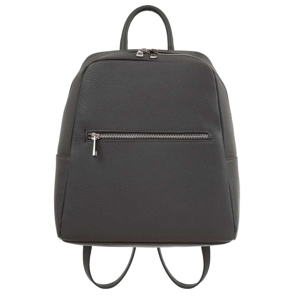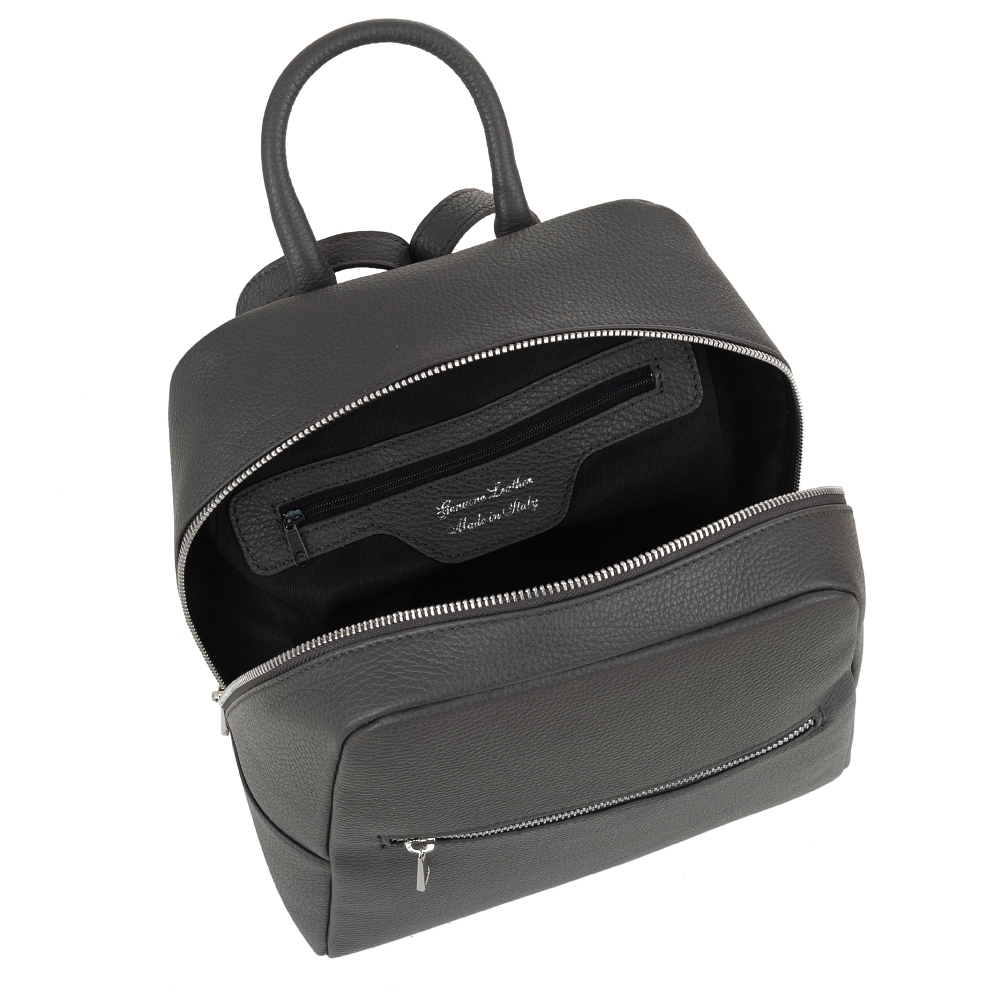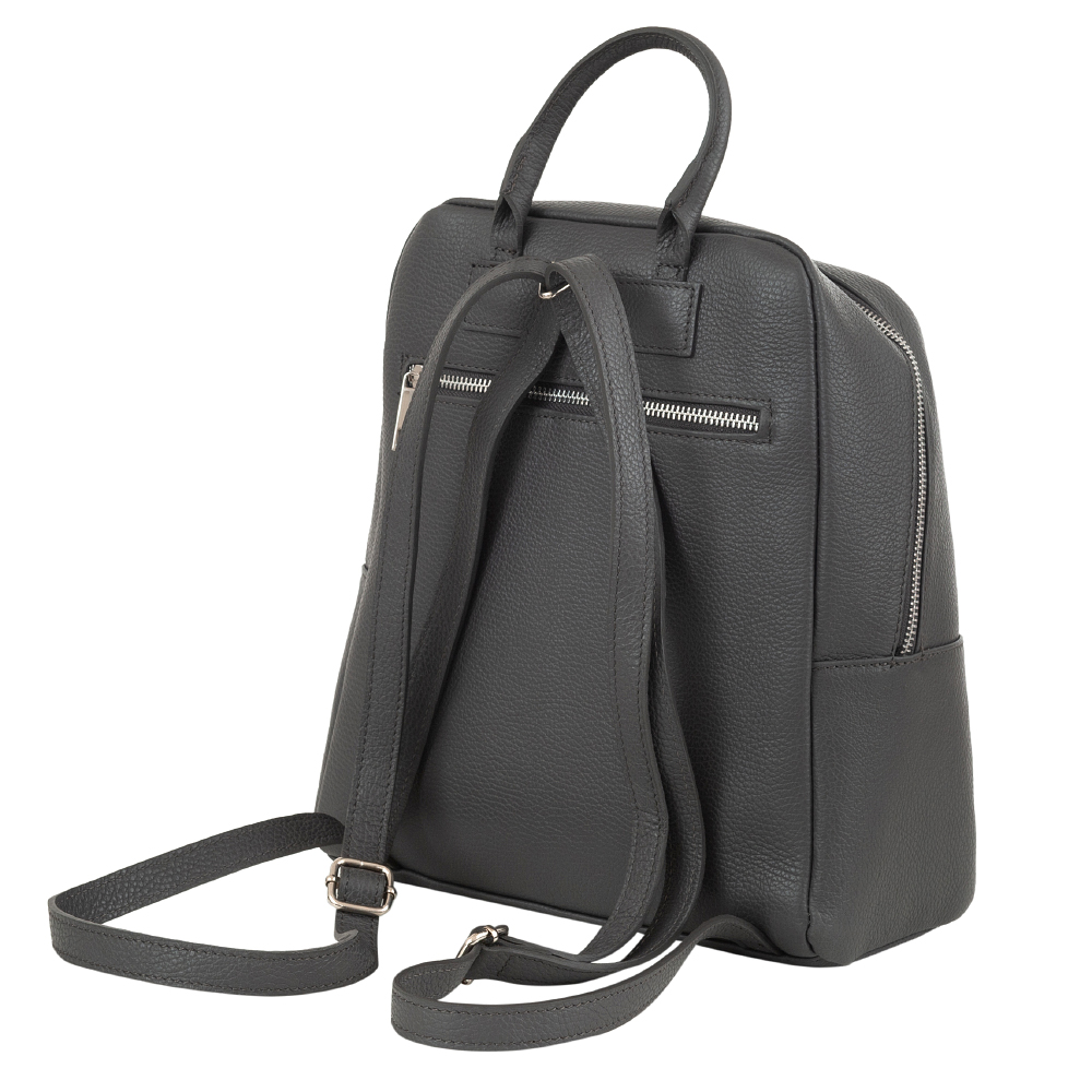 MADE IN ITALY - GENUINE LEATHER. Włoski modny i elegancki skórzany PLECAK torba wykonany w całości z wysokogatunkowej naturalnej, miękkiej skóry. Zamykany na zamek. W głównej komorze kieszeń na telefon + kieszonka na zamek + dodatkowa kieszonka. Wnętrze wykończone materiałową trwałą, czarną podszewką. Dodatkowo jedna kieszonka pozioma z przodu i z tyłu. Plecak lekko usztywniony od spodu. Elementy wykończenia w kolorze srebrnym. Uszy z możliwością regulacji długości 52-110 cm. Można nosić jako plecak lub w dłoni.