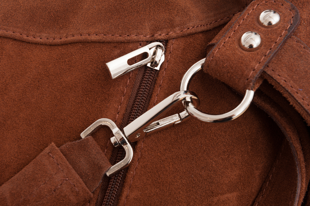 Włoska skórzana torebka worek wykonana w 100% z naturalnej skóry zamszowej. Zamykana z góry na suwak. Torebka dwukomorowa przedzielona dużą kieszenią na suwak. Wewnątrz jedna kieszonka na zamek, jedna na telefon + dodatkowa kieszeń. Dodatkowo z tyłu i po bokach kieszonki na suwak. Wnętrze wykończone trwałą podszewką. Dodatkowy pasek o długości do 109 cm. Możliwość całkowitego wypięcia krótszego ucha.