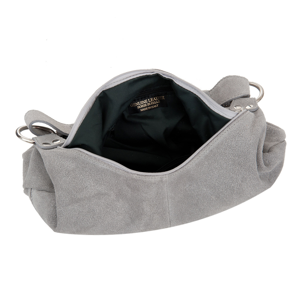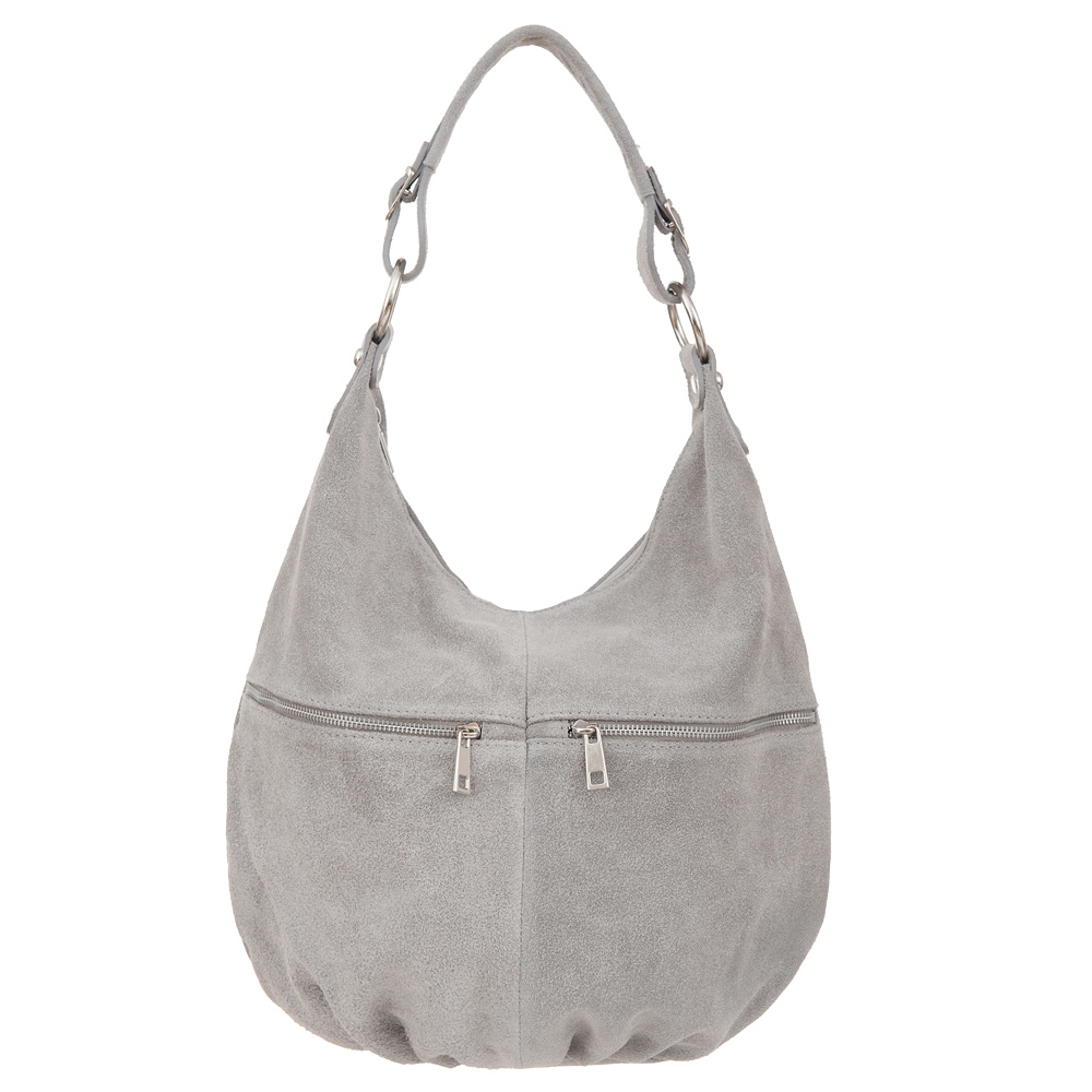 Włoska skórzana torebka / worek wykonana w 100% z naturalnej skóry zamszowej. Zamykana od góry na zamek. Torebka jednokomorowa przedzielona na środku dużą kieszenią na zamek. Dodatkowo wewnątrz jedna kieszonka na zamek, jedna na telefon + dodatkowa kieszeń. Z tyłu i z przodu kieszonki na zamek. Wnętrze wykończone materiałową trwałą podszewką. Dodatkowy pasek z o długości 106 cm. Elementy wykończenia w kolorze srebrnym.