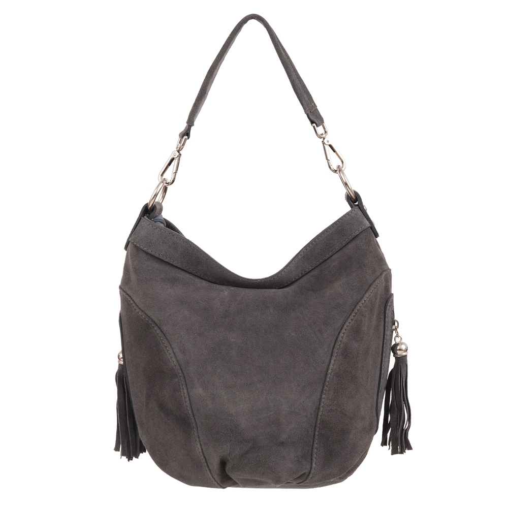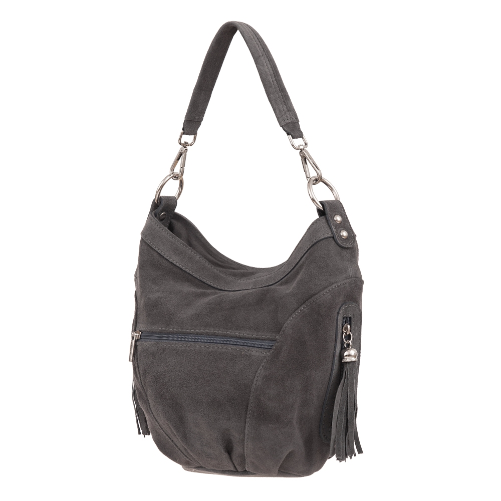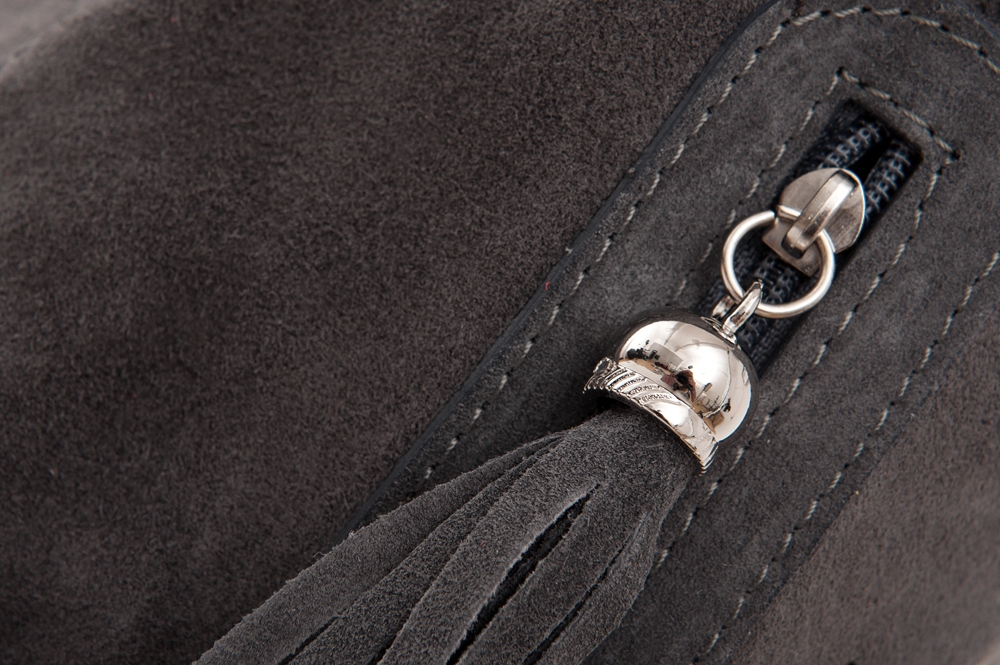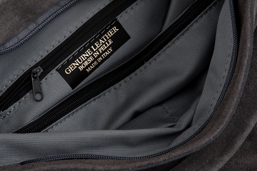 Włoska skórzana torebka worek wykonana w 100% z naturalnej skóry zamszowej. Zamykana z góry na suwak. Torebka dwukomorowa przedzielona dużą kieszenią na suwak. Wewnątrz jedna kieszonka na zamek, jedna na telefon + dodatkowa kieszeń. Dodatkowo z tyłu i po bokach kieszonki na suwak. Wnętrze wykończone trwałą podszewką. Dodatkowy pasek o długości do 109 cm. Możliwość całkowitego wypięcia krótszego ucha.