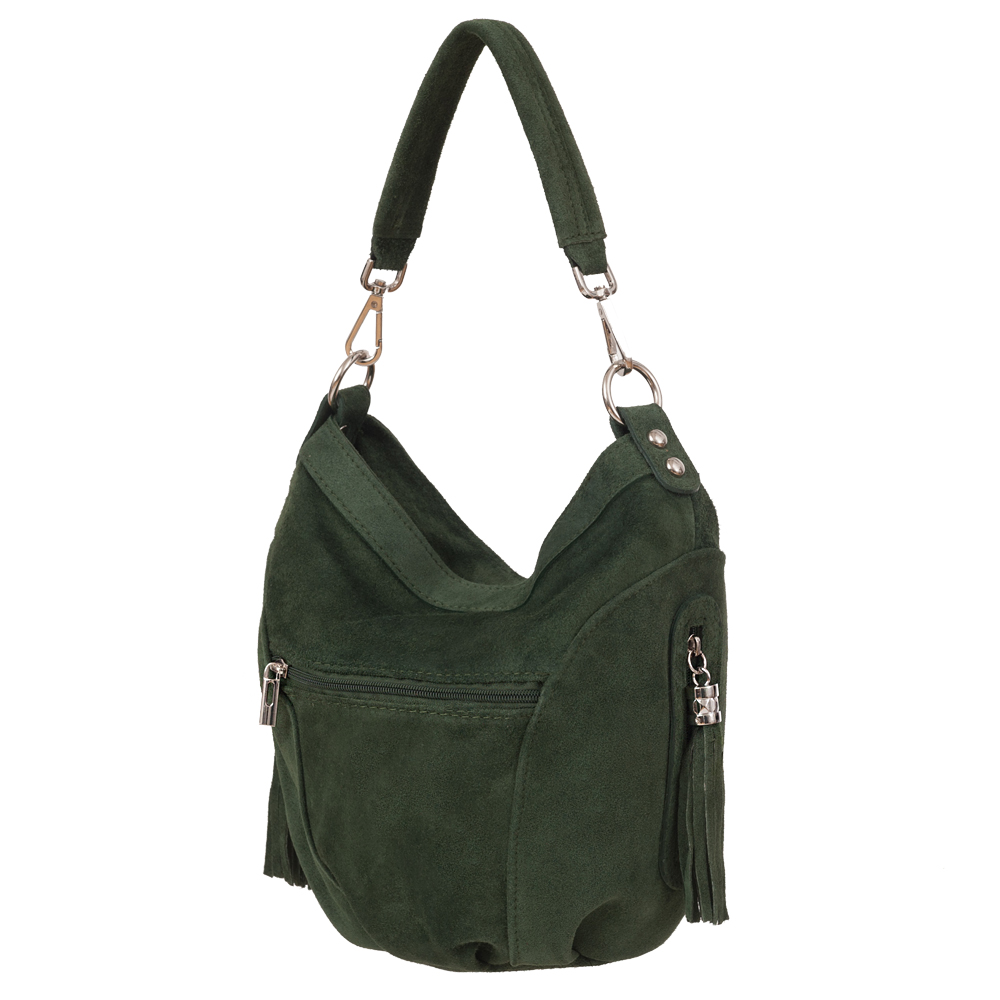 Włoska skórzana torebka worek wykonana w 100% z naturalnej skóry zamszowej. Zamykana z góry na suwak. Torebka dwukomorowa przedzielona dużą kieszenią na suwak. Wewnątrz jedna kieszonka na zamek, jedna na telefon + dodatkowa kieszeń. Dodatkowo z tyłu i po bokach kieszonki na suwak. Wnętrze wykończone trwałą podszewką. Dodatkowy pasek o długości do 109 cm. Możliwość całkowitego wypięcia krótszego ucha.