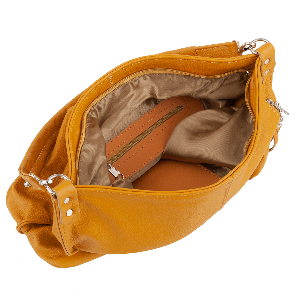 Skórzana torebka wykonana w całości z miękkiej naturalnej skóry licowej. Modny klasyczny model z odobnym pękiem frędzli przy kieszonce z przodu. Torebka zamykana od góry na zamek, jednokomorowa. Dodatkowo wewnątrz jedna kieszonka na zamek, jedna na telefon. Z przodu pionowa kieszeń na zamek. Wnętrze wykończone trwałą, materiałową podszewką. Elementy wykończenia w kolorze srebrnym. Dodatkowy długi, regulowany pasek w komplecie o długości max. 120 cm